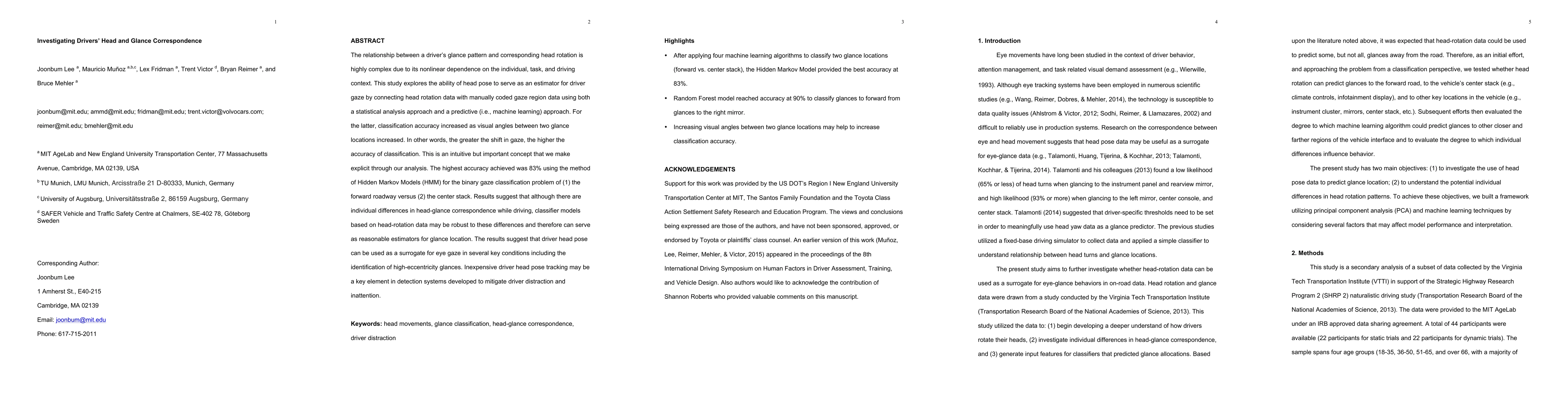 The relationship between a driver's glance pattern and corresponding head rotation is highly complex due to its nonlinear dependence on the individual, task, and driving context. This study explores the ability of head pose to serve as an estimator for driver gaze by connecting head rotation data with manually coded gaze region data using both a statistical analysis approach and a predictive (i.e., machine learning) approach. For the latter, classification accuracy increased as visual angles between two glance locations increased. In other words, the greater the shift in gaze, the higher the accuracy of classification. This is an intuitive but important concept that we make explicit through our analysis. The highest accuracy achieved was 83% using the method of Hidden Markov Models (HMM) for the binary gaze classification problem of (1) the forward roadway versus (2) the center stack. Results suggest that although there are individual differences in head-glance correspondence while driving, classifier models based on head-rotation data may be robust to these differences and therefore can serve as reasonable estimators for glance location. The results suggest that driver head pose can be used as a surrogate for eye gaze in several key conditions including the identification of high-eccentricity glances. Inexpensive driver head pose tracking may be a key element in detection systems developed to mitigate driver distraction and inattention.