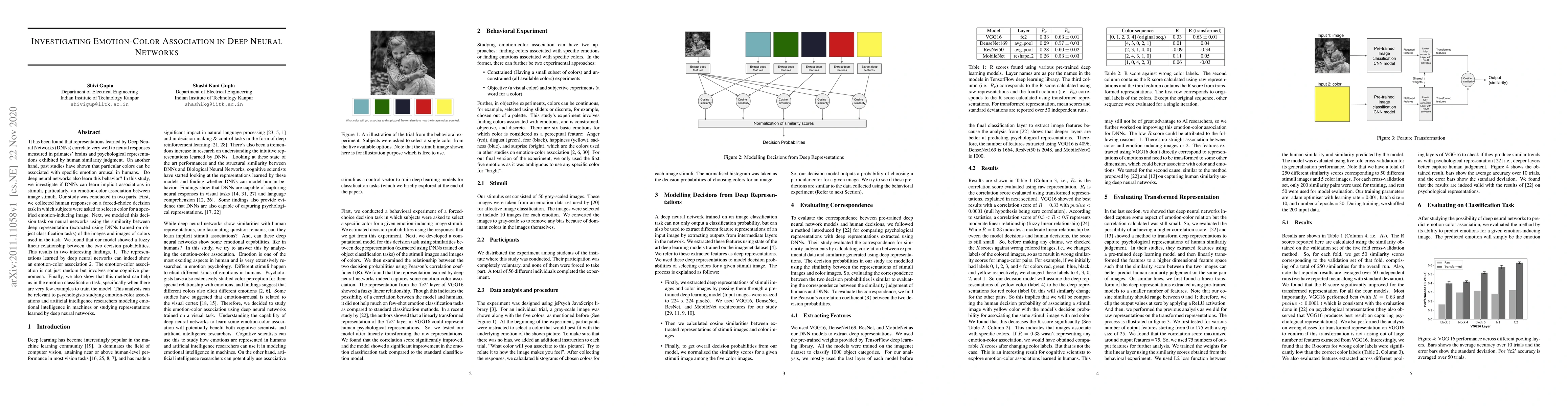 It has been found that representations learned by Deep Neural Networks (DNNs) correlate very well to neural responses measured in primates' brains and psychological representations exhibited by human similarity judgment. On another hand, past studies have shown that particular colors can be associated with specific emotion arousal in humans. Do deep neural networks also learn this behavior? In this study, we investigate if DNNs can learn implicit associations in stimuli, particularly, an emotion-color association between image stimuli. Our study was conducted in two parts. First, we collected human responses on a forced-choice decision task in which subjects were asked to select a color for a specified emotion-inducing image. Next, we modeled this decision task on neural networks using the similarity between deep representation (extracted using DNNs trained on object classification tasks) of the images and images of colors used in the task. We found that our model showed a fuzzy linear relationship between the two decision probabilities. This results in two interesting findings, 1. The representations learned by deep neural networks can indeed show an emotion-color association 2. The emotion-color association is not just random but involves some cognitive phenomena. Finally, we also show that this method can help us in the emotion classification task, specifically when there are very few examples to train the model. This analysis can be relevant to psychologists studying emotion-color associations and artificial intelligence researchers modeling emotional intelligence in machines or studying representations learned by deep neural networks.