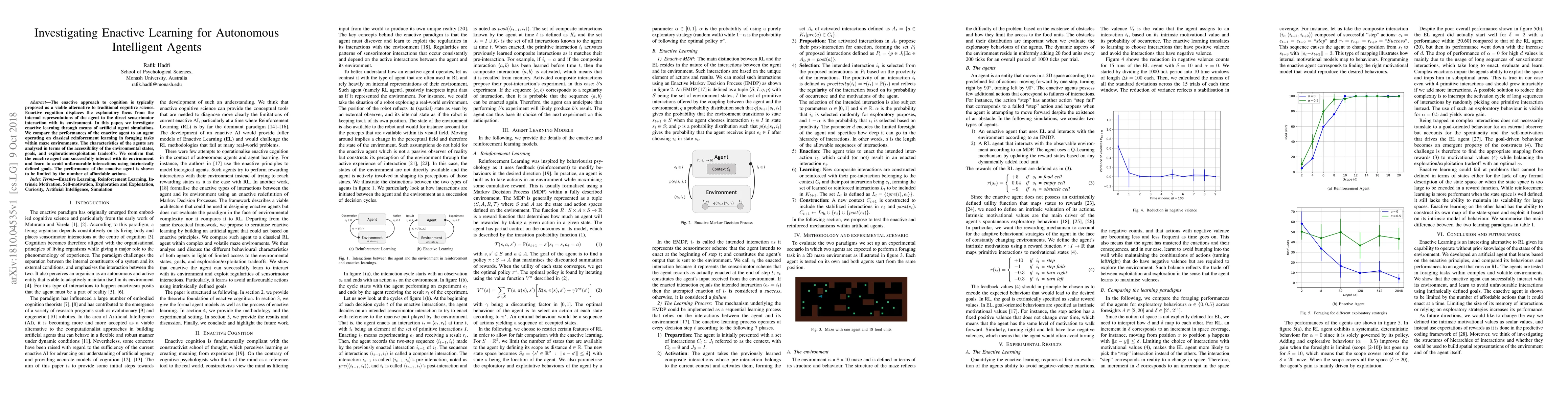 Enactive learning enables intelligent agents to learn through direct sensorimotor interaction with their environment, outperforming classical reinforcement learning in foraging tasks within maze environments.