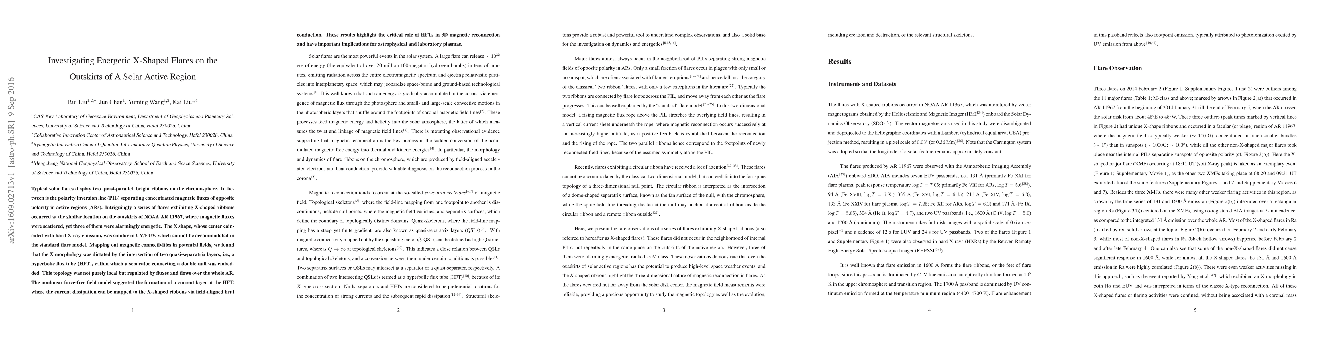 Typical solar flares display two quasi-parallel, bright ribbons on the chromosphere. In between is the polarity inversion line (PIL) separating concentrated magnetic fluxes of opposite polarity in active regions (ARs). Intriguingly a series of flares exhibiting X-shaped ribbons occurred at the similar location on the outskirts of NOAA AR 11967, where magnetic fluxes were scattered, yet three of them were alarmingly energetic. The X shape, whose center coincided with hard X-ray emission, was similar in UV/EUV, which cannot be accommodated in the standard flare model. Mapping out magnetic connectivities in potential fields, we found that the X morphology was dictated by the intersection of two quasi-separatrix layers, i.e., a hyperbolic flux tube (HFT), within which a separator connecting a double null was embedded. This topology was not purely local but regulated by fluxes and flows over the whole AR. The nonlinear force-free field model suggested the formation of a current layer at the HFT, where the current dissipation can be mapped to the X-shaped ribbons via field-aligned heat conduction. These results highlight the critical role of HFTs in 3D magnetic reconnection and have important implications for astrophysical and laboratory plasmas.