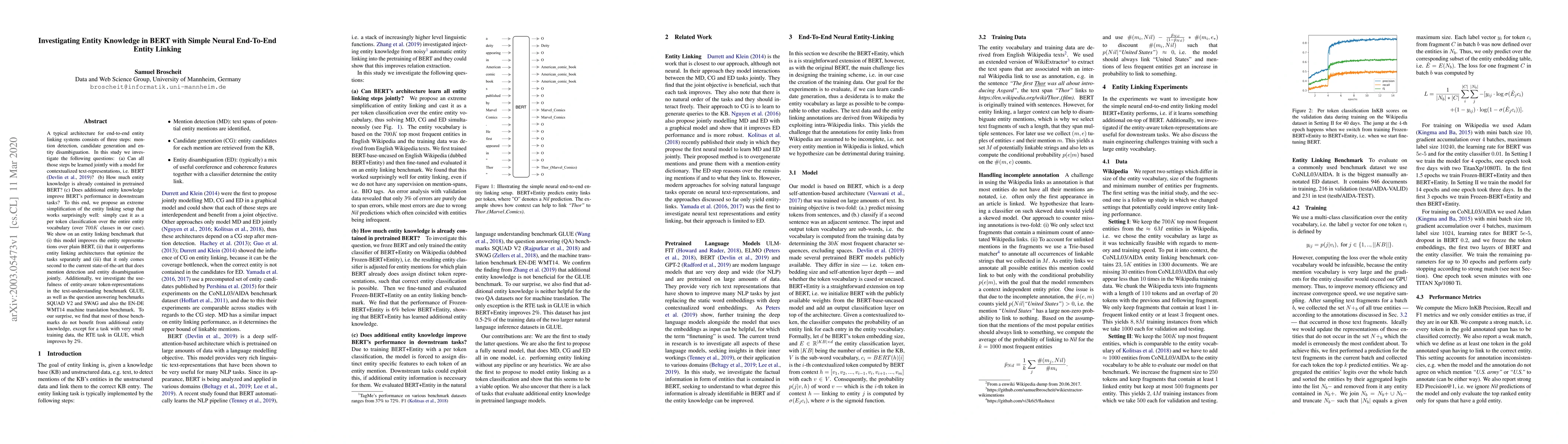 This study explores integrating entity linking into BERT through a simplified per-token classification approach, showing it outperforms traditional architectures and enhances BERT's performance in some tasks, though most GLUE, SQUAD V2, and WMT14 benchmarks do not benefit from added entity knowledge.