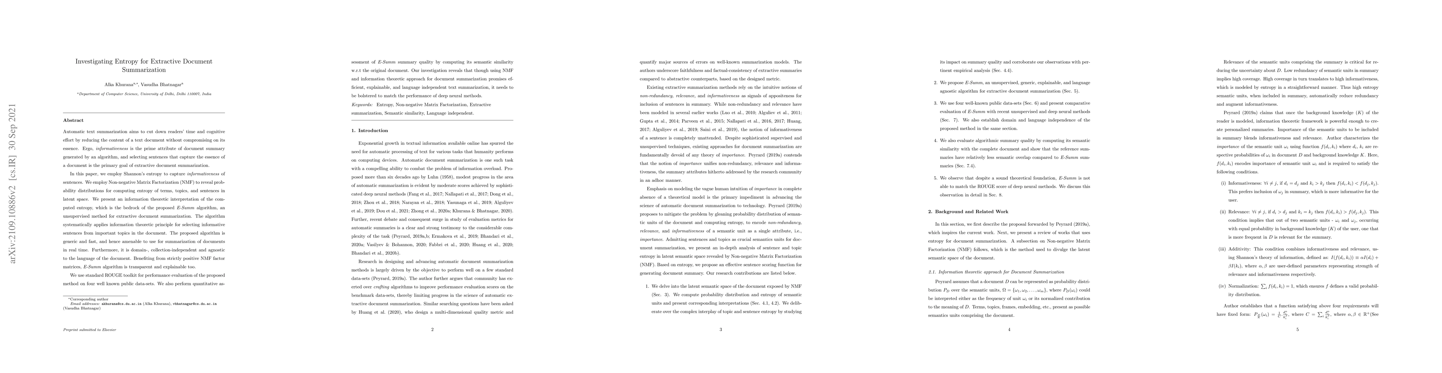 This paper proposes E-Summ, an unsupervised extractive document summarization algorithm that uses Shannon entropy and Non-negative Matrix Factorization (NMF) to select informative sentences. Despite its efficiency and transparency, the method falls short in performance compared to deep learning approaches.
