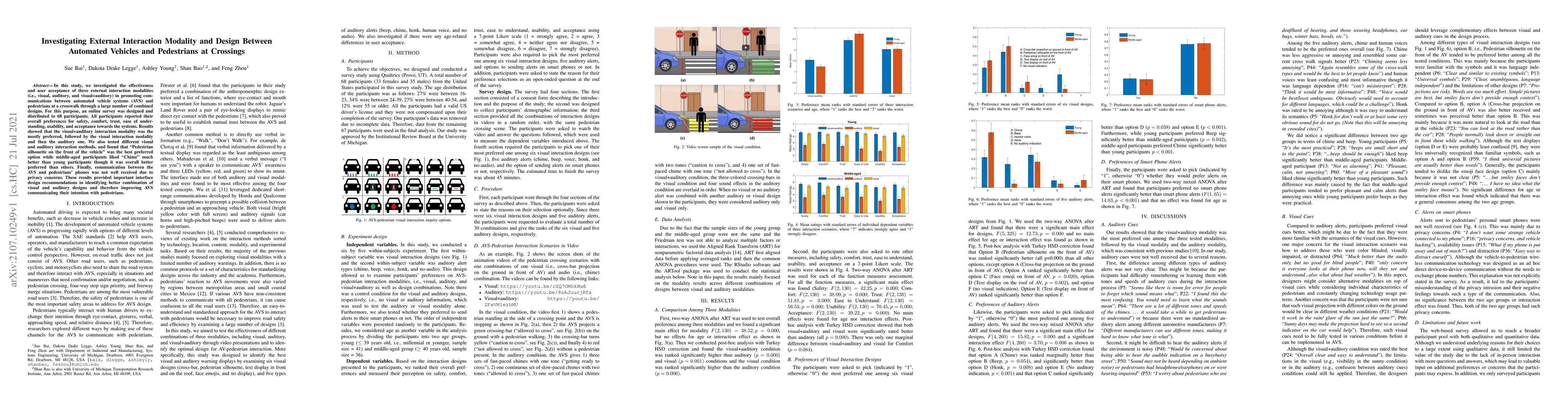 In this study, we investigated the effectiveness and user acceptance of three external interaction modalities (i.e., visual, auditory, and visual+auditory) in promoting communications between automated vehicle systems (AVS) and pedestrians at a crosswalk through a large number of combined designs. For this purpose, an online survey was designed and distributed to 68 participants. All participants reported their overall preferences for safety, comfort, trust, ease of understanding, usability, and acceptance towards the systems. Results showed that the visual+auditory interaction modality was the mostly preferred, followed by the visual interaction modality and then the auditory one. We also tested different visual and auditory interaction methods, and found that "Pedestrian silhouette on the front of the vehicle" was the best preferred option while middle-aged participants liked "Chime" much better than young participants though it was overall better preferred than others. Finally, communication between the AVS and pedestrians' phones was not well received due to privacy concerns. These results provided important interface design recommendations in identifying better combination of visual and auditory designs and therefore improving AVS communicating their intention with pedestrians.