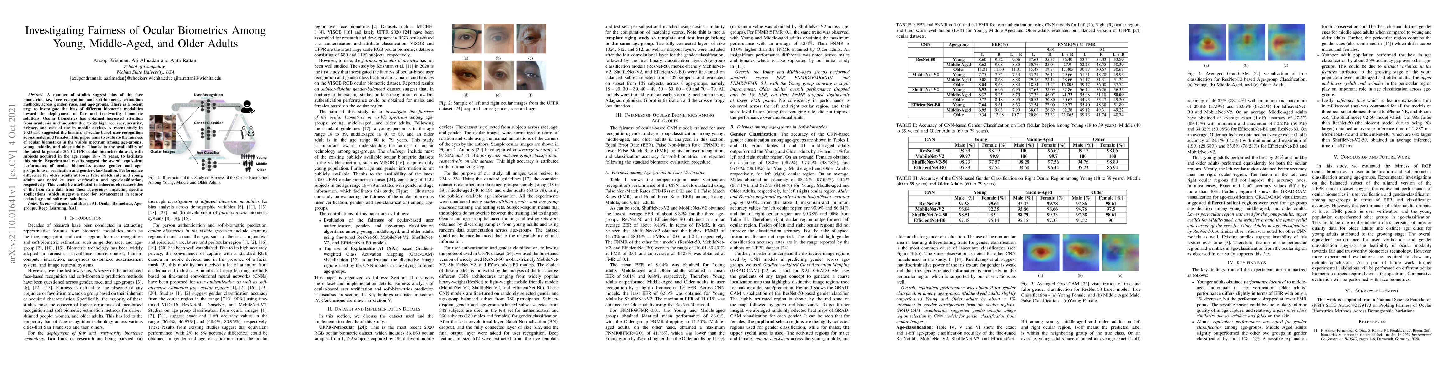 This study evaluates the fairness of ocular biometrics across young, middle-aged, and older adults, finding equivalent performance for user verification and gender classification. Some performance differences for older adults in lower false match rates and young adults in age classification suggest the need for sensor and software advancements.
