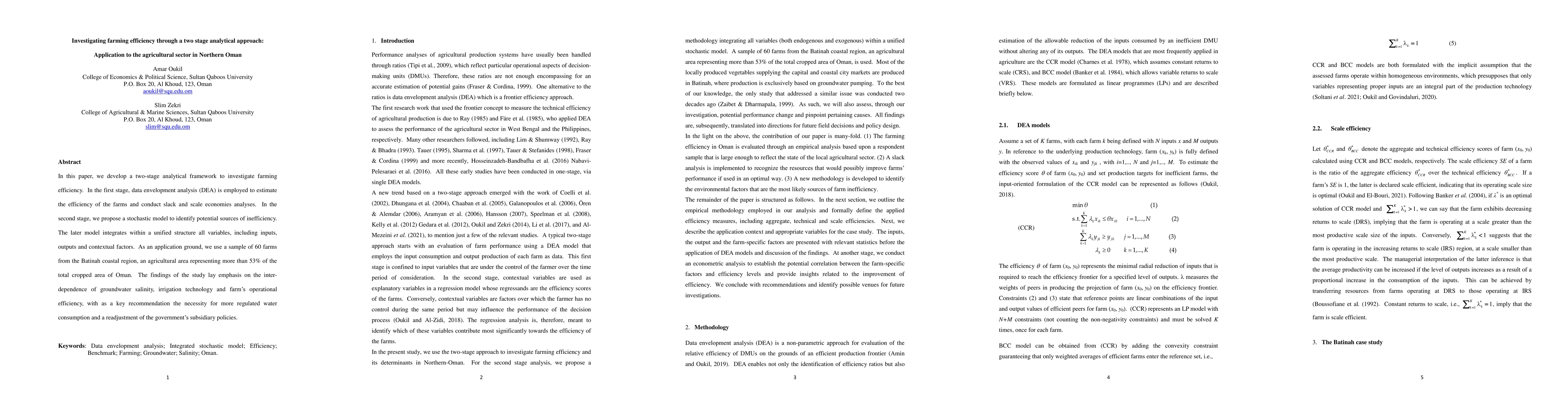 This paper develops a two-stage analytical framework to assess farming efficiency in Northern Oman, employing data envelopment analysis and a stochastic model to identify inefficiency sources. The study emphasizes the inter-dependence of groundwater salinity, irrigation technology, and farm operational efficiency, recommending regulated water use and policy adjustments.