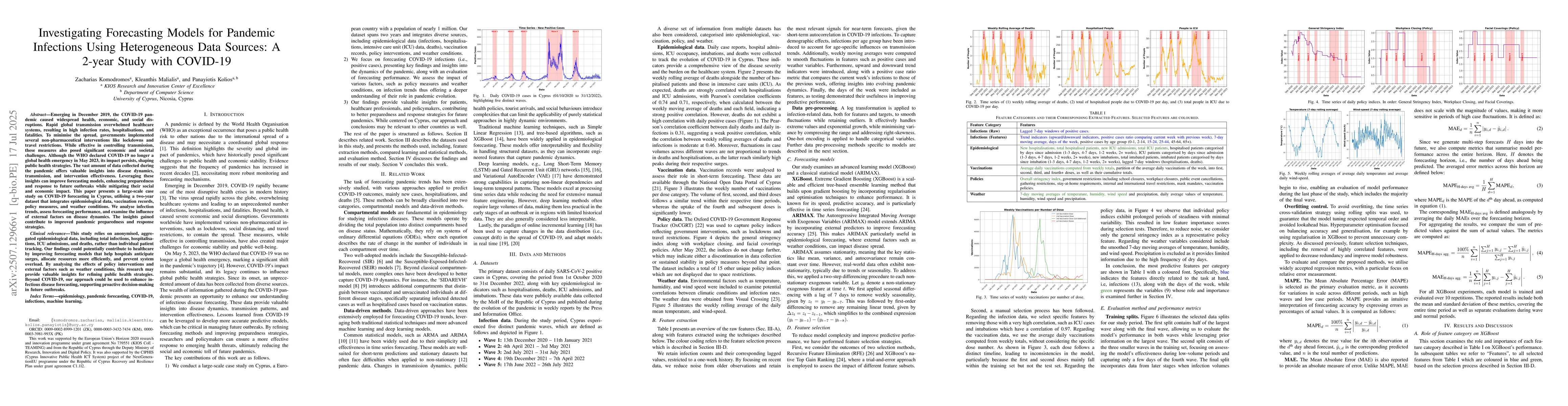 Emerging in December 2019, the COVID-19 pandemic caused widespread health, economic, and social disruptions. Rapid global transmission overwhelmed healthcare systems, resulting in high infection rates, hospitalisations, and fatalities. To minimise the spread, governments implemented several non-pharmaceutical interventions like lockdowns and travel restrictions. While effective in controlling transmission, these measures also posed significant economic and societal challenges. Although the WHO declared COVID-19 no longer a global health emergency in May 2023, its impact persists, shaping public health strategies. The vast amount of data collected during the pandemic offers valuable insights into disease dynamics, transmission, and intervention effectiveness. Leveraging these insights can improve forecasting models, enhancing preparedness and response to future outbreaks while mitigating their social and economic impact. This paper presents a large-scale case study on COVID-19 forecasting in Cyprus, utilising a two-year dataset that integrates epidemiological data, vaccination records, policy measures, and weather conditions. We analyse infection trends, assess forecasting performance, and examine the influence of external factors on disease dynamics. The insights gained contribute to improved pandemic preparedness and response strategies.