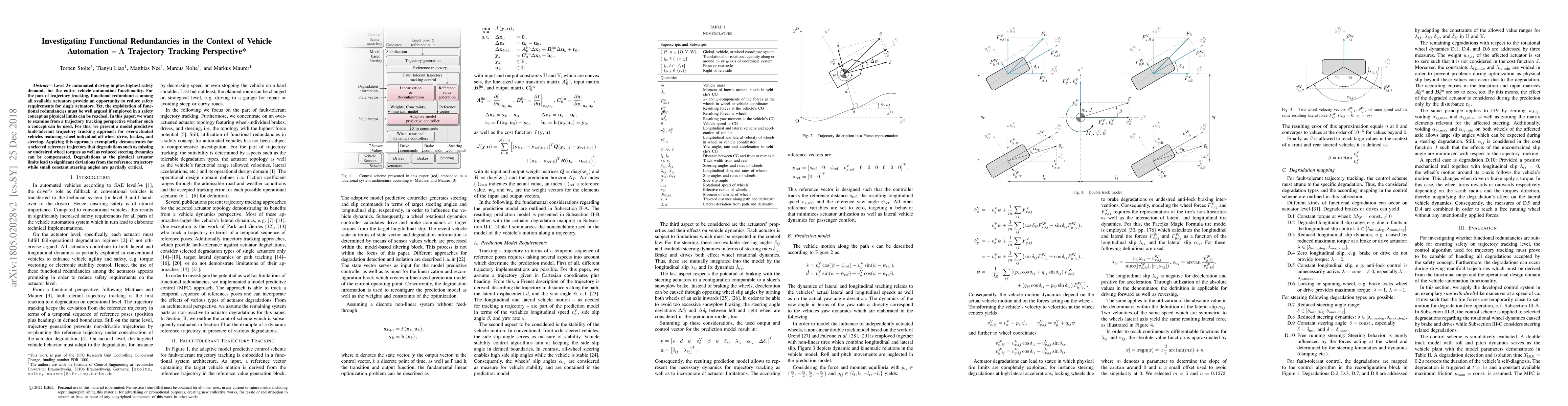 Level 3+ automated driving implies highest safety demands for the entire vehicle automation functionality. For the part of trajectory tracking, functional redundancies among all available actuators provide an opportunity to reduce safety requirements for single actuators. Yet, the exploitation of functional redundancies must be well argued if employed in a safety concept as physical limits can be reached. In this paper, we want to examine from a trajectory tracking perspective whether such a concept can be used. For this, we present a model predictive fault-tolerant trajectory tracking approach for over-actuated vehicles featuring wheel individual all-wheel drive, brakes, and steering. Applying this approach exemplarily demonstrates for a selected reference trajectory that degradations such as missing or undesired wheel torques as well as reduced steering dynamics can be compensated. Degradations at the physical actuator limits lead to significant deviations from the reference trajectory while small constant steering angles are partially critical.