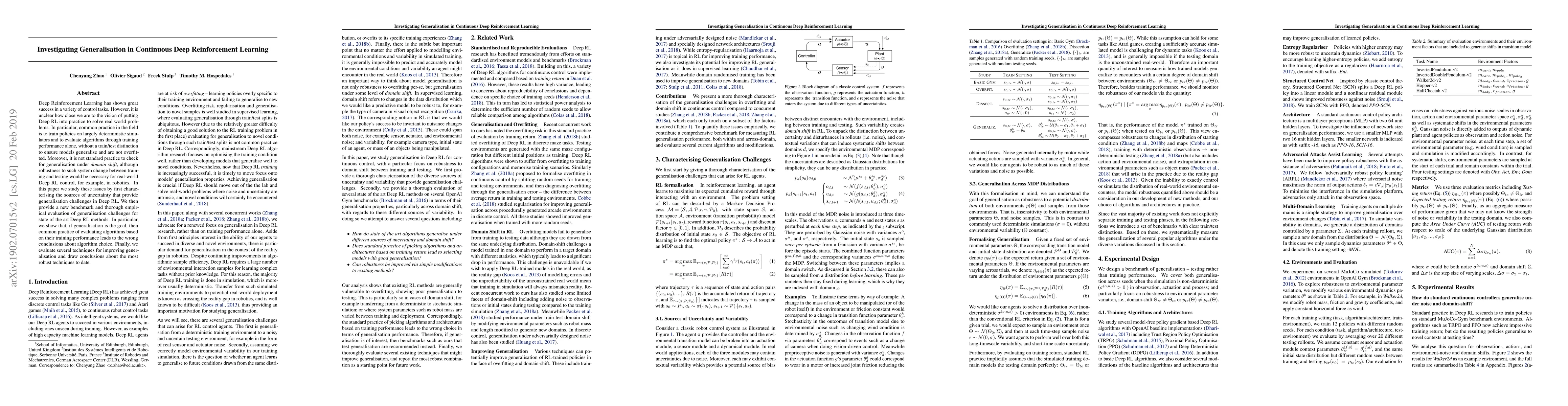 Deep Reinforcement Learning has shown great success in a variety of control tasks. However, it is unclear how close we are to the vision of putting Deep RL into practice to solve real world problems. In particular, common practice in the field is to train policies on largely deterministic simulators and to evaluate algorithms through training performance alone, without a train/test distinction to ensure models generalise and are not overfitted. Moreover, it is not standard practice to check for generalisation under domain shift, although robustness to such system change between training and testing would be necessary for real-world Deep RL control, for example, in robotics. In this paper we study these issues by first characterising the sources of uncertainty that provide generalisation challenges in Deep RL. We then provide a new benchmark and thorough empirical evaluation of generalisation challenges for state of the art Deep RL methods. In particular, we show that, if generalisation is the goal, then common practice of evaluating algorithms based on their training performance leads to the wrong conclusions about algorithm choice. Finally, we evaluate several techniques for improving generalisation and draw conclusions about the most robust techniques to date.