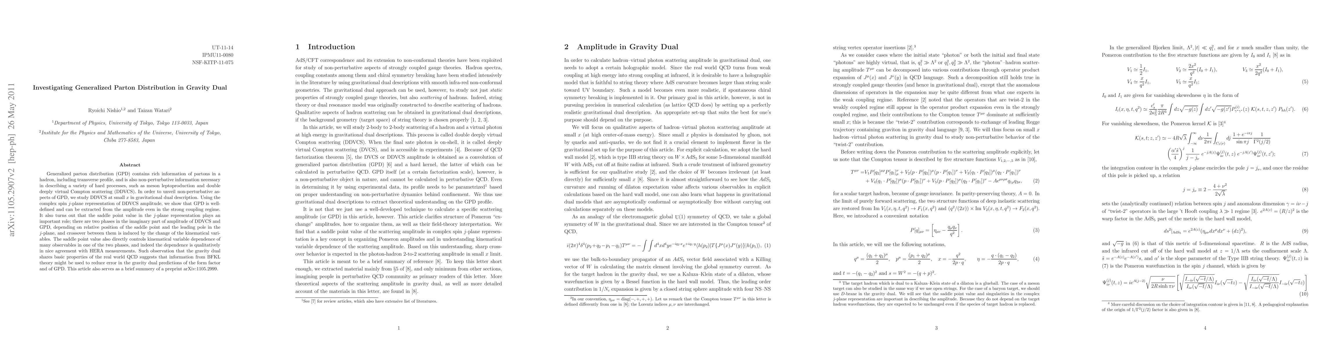 Generalized parton distribution (GPD) contains rich information of partons in a hadron, including transverse profile, and is also non-perturbative information necessary in describing a variety of hard processes, such as meson leptoproduction and double deeply virtual Compton scattering (DDVCS). In order to unveil non-perturbative aspects of GPD, we study DDVCS at small $x$ in gravitational dual description. Using the complex spin $j$-plane representation of DDVCS amplitude, we show that GPD is well-defined and can be extracted from the amplitude even in the strong coupling regime. It also turns out that the saddle point value in the $j$-plane representation plays an important role; there are two phases in the imaginary part of the amplitude of DDVCS and GPD, depending on relative position of the saddle point and the leading pole in the $j$-plane, and crossover between them is induced by the change of the kinematical variables. The saddle point value also directly controls kinematical variable dependence of many observables in one of the two phases, and indeed the dependence is qualitatively in nice agreement with HERA measurements. Such observation that the gravity dual shares basic properties of the real world QCD suggests that information from BFKL theory might be used to reduce error in the gravity dual predictions of the form factor and of GPD. This article also serves as a brief summery of a preprint arXiv:1105.2999.