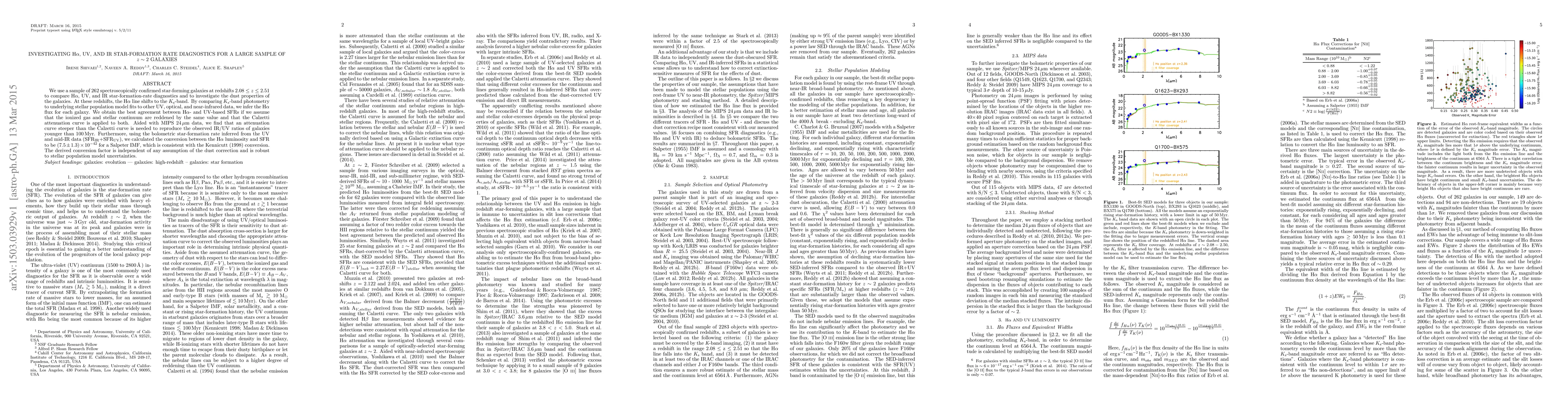 This study compares H$\alpha$, UV, and IR star-formation rate diagnostics for 262 star-forming galaxies at redshifts 2.08 ≤ z ≤ 2.51, finding best agreement between H$\alpha$- and UV-based SFRs when applying the same Calzetti attenuation curve. A steeper attenuation curve than Calzetti is needed for younger galaxies, and the derived H$\alpha$ to SFR conversion factor is consistent with Kennicutt's (1998) value.