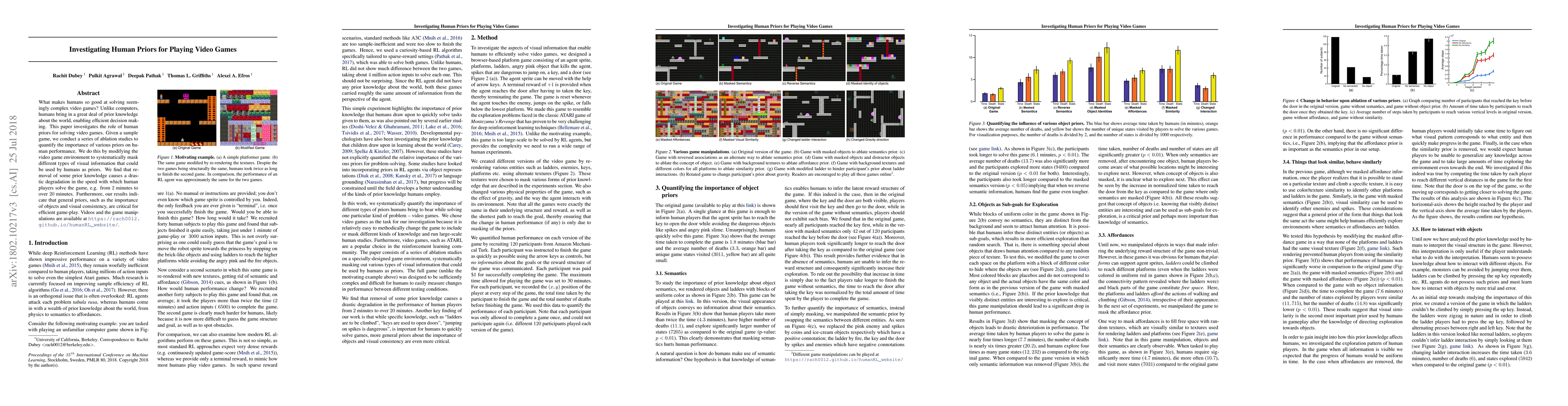 This research explores how human prior knowledge impacts video game performance. By altering game visuals, it's shown that certain priors (like object importance and visual consistency) significantly boost human efficiency, with their removal causing game-solving times to increase drastically.