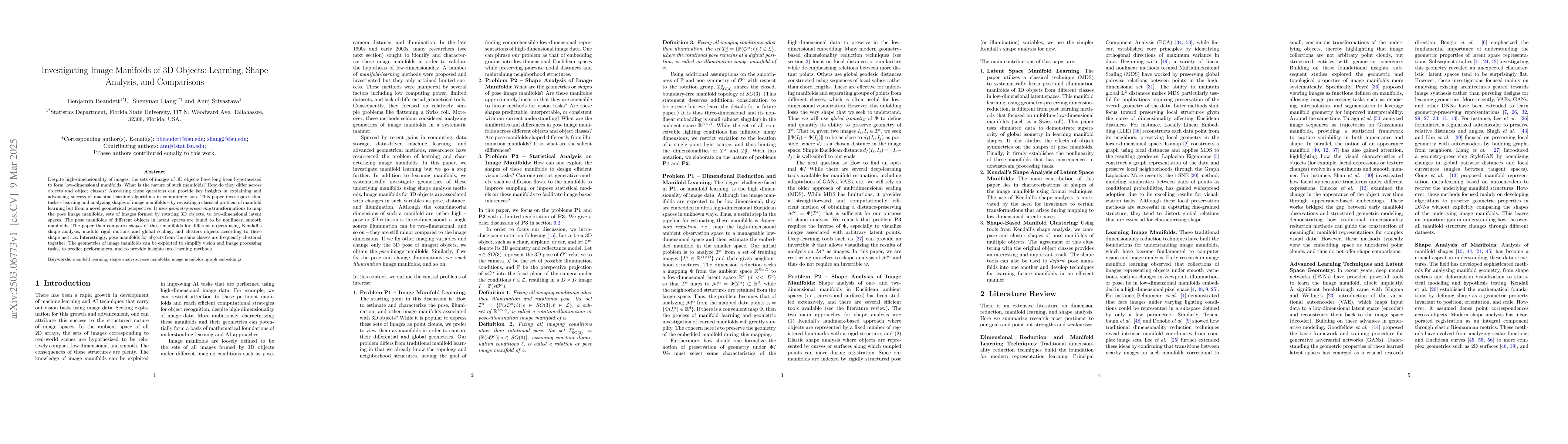 Despite high-dimensionality of images, the sets of images of 3D objects have long been hypothesized to form low-dimensional manifolds. What is the nature of such manifolds? How do they differ across objects and object classes? Answering these questions can provide key insights in explaining and advancing success of machine learning algorithms in computer vision. This paper investigates dual tasks -- learning and analyzing shapes of image manifolds -- by revisiting a classical problem of manifold learning but from a novel geometrical perspective. It uses geometry-preserving transformations to map the pose image manifolds, sets of images formed by rotating 3D objects, to low-dimensional latent spaces. The pose manifolds of different objects in latent spaces are found to be nonlinear, smooth manifolds. The paper then compares shapes of these manifolds for different objects using Kendall's shape analysis, modulo rigid motions and global scaling, and clusters objects according to these shape metrics. Interestingly, pose manifolds for objects from the same classes are frequently clustered together. The geometries of image manifolds can be exploited to simplify vision and image processing tasks, to predict performances, and to provide insights into learning methods.