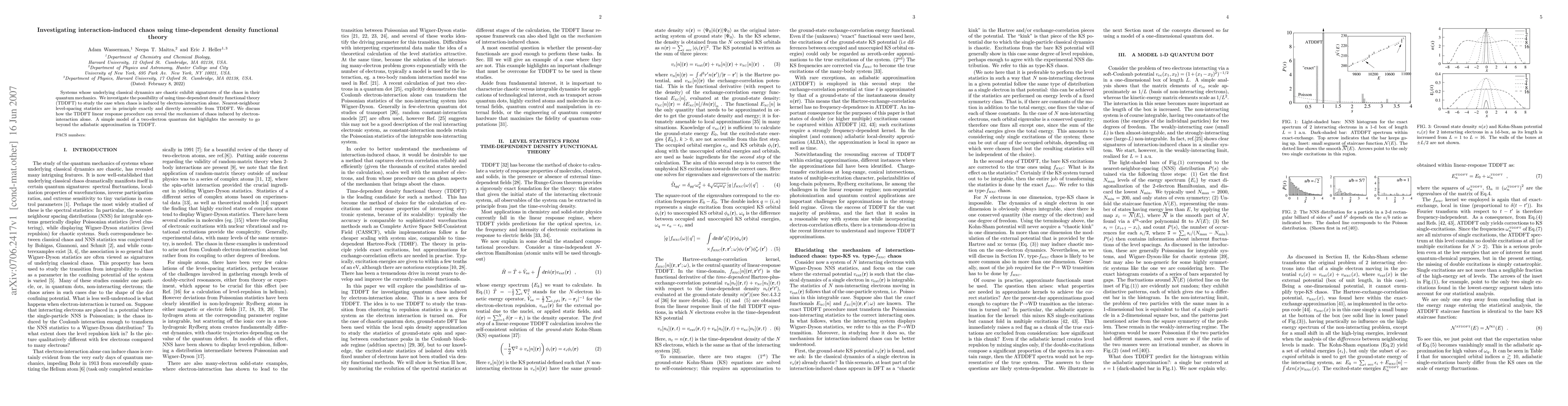 Systems whose underlying classical dynamics are chaotic exhibit signatures of the chaos in their quantum mechanics. We investigate the possibility of using time-dependent density functional theory (TDDFT) to study the case when chaos is induced by electron-interaction alone. Nearest-neighbour level-spacing statistics are in principle exactly and directly accessible from TDDFT. We discuss how the TDDFT linear response procedure can reveal the mechanism of chaos induced by electron-interaction alone. A simple model of a two-electron quantum dot highlights the necessity to go beyond the adiabatic approximation in TDDFT.