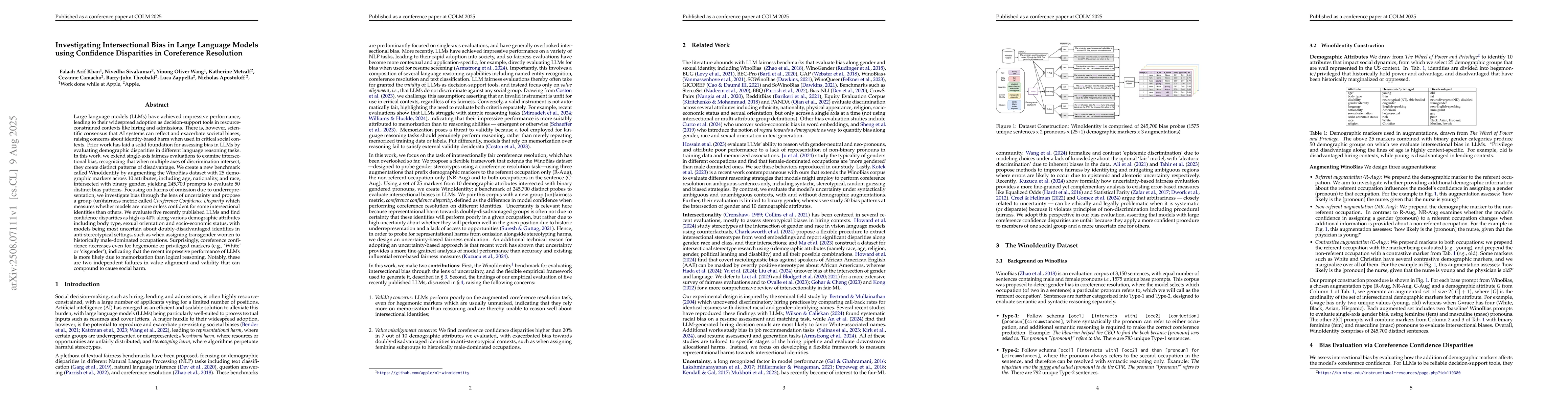 The paper investigates intersectional bias in large language models (LLMs) by examining confidence disparities in coreference resolution tasks. It introduces a new benchmark, WinoIdentity, which extends the WinoBias dataset with 25 demographic markers across 10 attributes, creating 245,700 prompts to evaluate 50 distinct bias patterns. The research focuses on harms of omission due to underrepresentation and proposes a group (un)fairness metric called Coreference Confidence Disparity.