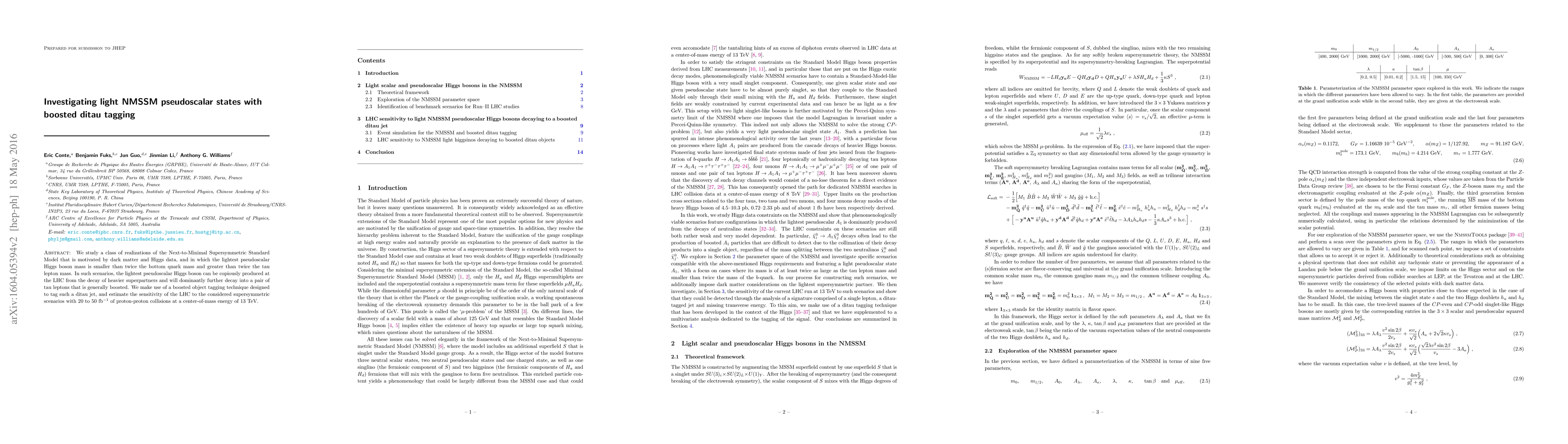 We study a class of realizations of the Next-to-Minimal Supersymmetric Standard Model that is motivated by dark matter and Higgs data, and in which the lightest pseudoscalar Higgs boson mass is smaller than twice the bottom quark mass and greater than twice the tau lepton mass. In such scenarios, the lightest pseudoscalar Higgs boson can be copiously produced at the LHC from the decay of heavier superpartners and will dominantly further decay into a pair of tau leptons that is generally boosted. We make use of a boosted object tagging technique designed to tag such a ditau jet, and estimate the sensitivity of the LHC to the considered supersymmetric scenarios with 20 to 50~fb$^{-1}$ of proton-proton collisions at a center-of-mass energy of 13~TeV.