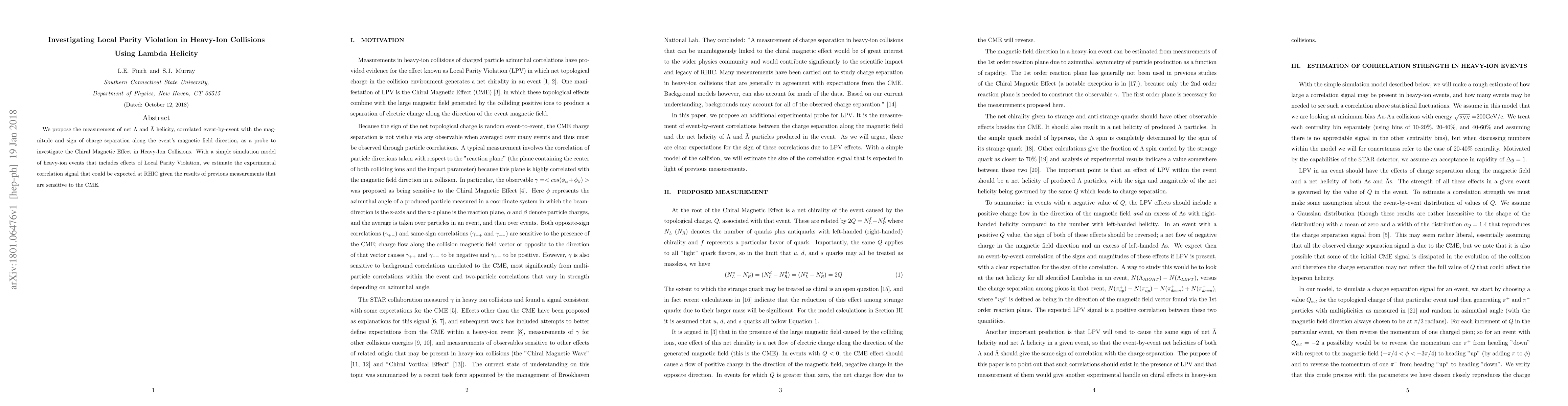 This paper proposes measuring the net lambda ($\Lambda$) and anti-lambda ($\bar{\Lambda}$) helicity in heavy-ion collisions to investigate the Chiral Magnetic Effect (CME) through local parity violation. Simulations predict the expected correlation signal at RHIC based on previous CME-sensitive measurements.