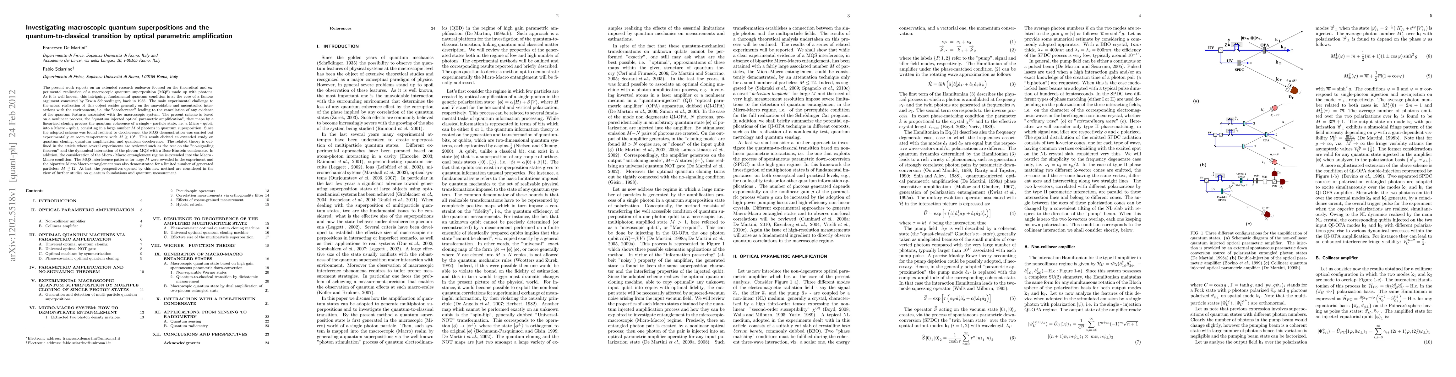 This paper investigates macroscopic quantum superpositions (MQS) using optical parametric amplification, demonstrating an MQS composed of $10^{4}$ photons resilient to decoherence. The study explores quantum cloning, amplification, and decoherence, revealing interference patterns and demonstrating Micro-Macro entanglement, thus advancing quantum foundations research.