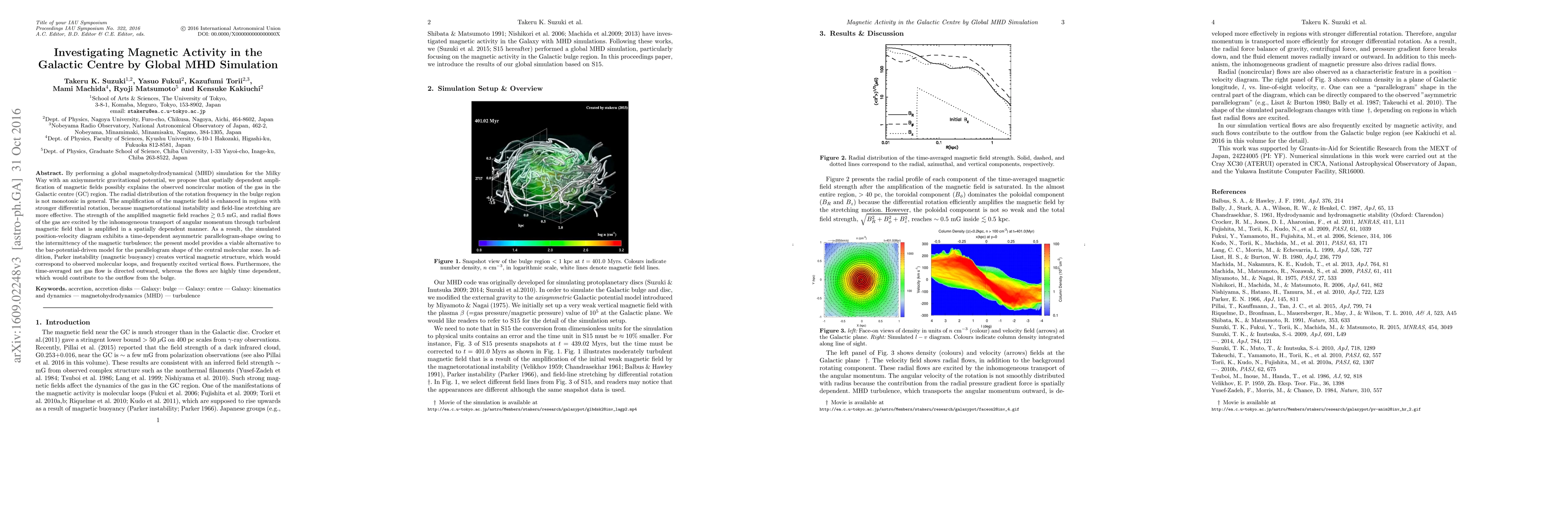 By performing a global magnetohydrodynamical (MHD) simulation for the Milky Way with an axisymmetric gravitational potential, we propose that spatially dependent amplification of magnetic fields possibly explains the observed noncircular motion of the gas in the Galactic centre (GC) region. The radial distribution of the rotation frequency in the bulge region is not monotonic in general. The amplification of the magnetic field is enhanced in regions with stronger differential rotation, because magnetorotational instability and field-line stretching are more effective. The strength of the amplified magnetic field reaches >~ 0.5 mG, and radial flows of the gas are excited by the inhomogeneous transport of angular momentum through turbulent magnetic field that is amplified in a spatially dependent manner. As a result, the simulated position-velocity diagram exhibits a time-dependent asymmetric parallelogram-shape owing to the intermittency of the magnetic turbulence; the present model provides a viable alternative to the bar-potential-driven model for the parallelogram shape of the central molecular zone. In addition, Parker instability (magnetic buoyancy) creates vertical magnetic structure, which would correspond to observed molecular loops, and frequently excited vertical flows. Furthermore, the time-averaged net gas flow is directed outward, whereas the flows are highly time dependent, which would contribute to the outflow from the bulge.