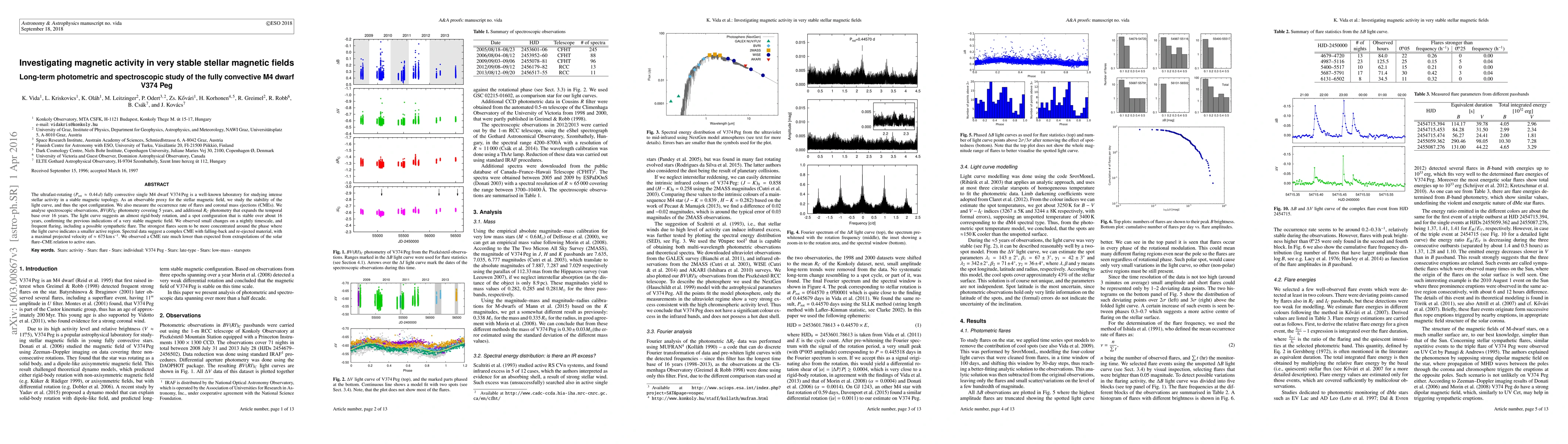 The ultrafast-rotating ($P_\mathrm{rot}\approx0.44 d$) fully convective single M4 dwarf V374 Peg is a well-known laboratory for studying intense stellar activity in a stable magnetic topology. As an observable proxy for the stellar magnetic field, we study the stability of the light curve, and thus the spot configuration. We also measure the occurrence rate of flares and coronal mass ejections (CMEs). We analyse spectroscopic observations, $BV(RI)_C$ photometry covering 5 years, and additional $R_C$ photometry that expands the temporal base over 16 years. The light curve suggests an almost rigid-body rotation, and a spot configuration that is stable over about 16 years, confirming the previous indications of a very stable magnetic field. We observed small changes on a nightly timescale, and frequent flaring, including a possible sympathetic flare. The strongest flares seem to be more concentrated around the phase where the light curve indicates a smaller active region. Spectral data suggest a complex CME with falling-back and re-ejected material, with a maximal projected velocity of $\approx$675km/s. We observed a CME rate much lower than expected from extrapolations of the solar flare-CME relation to active stars.