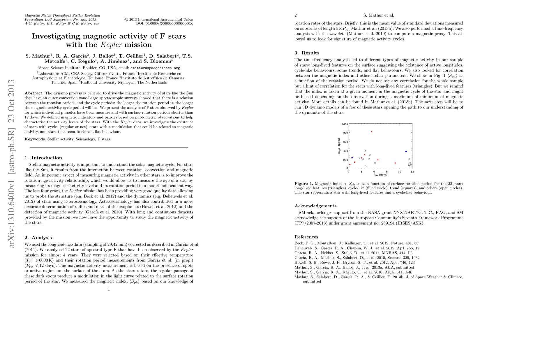 The Kepler mission analyzed F stars with short rotation periods to study magnetic activity cycles, finding some stars with regular cycles, modulation related to magnetic activity, and flat behavior patterns.