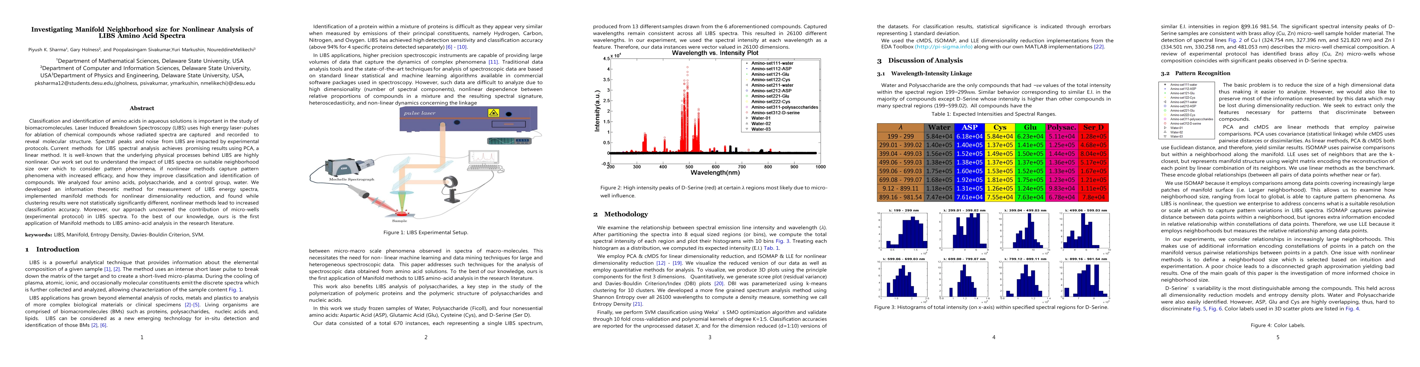 Classification and identification of amino acids in aqueous solutions is important in the study of biomacromolecules. Laser Induced Breakdown Spectroscopy (LIBS) uses high energy laser-pulses for ablation of chemical compounds whose radiated spectra are captured and recorded to reveal molecular structure. Spectral peaks and noise from LIBS are impacted by experimental protocols. Current methods for LIBS spectral analysis achieves promising results using PCA, a linear method. It is well-known that the underlying physical processes behind LIBS are highly nonlinear. Our work set out to understand the impact of LIBS spectra on suitable neighborhood size over which to consider pattern phenomena, if nonlinear methods capture pattern phenomena with increased efficacy, and how they improve classification and identification of compounds. We analyzed four amino acids, polysaccharide, and a control group, water. We developed an information theoretic method for measurement of LIBS energy spectra, implemented manifold methods for nonlinear dimensionality reduction, and found while clustering results were not statistically significantly different, nonlinear methods lead to increased classification accuracy. Moreover, our approach uncovered the contribution of micro-wells (experimental protocol) in LIBS spectra. To the best of our knowledge, ours is the first application of Manifold methods to LIBS amino-acid analysis in the research literature.