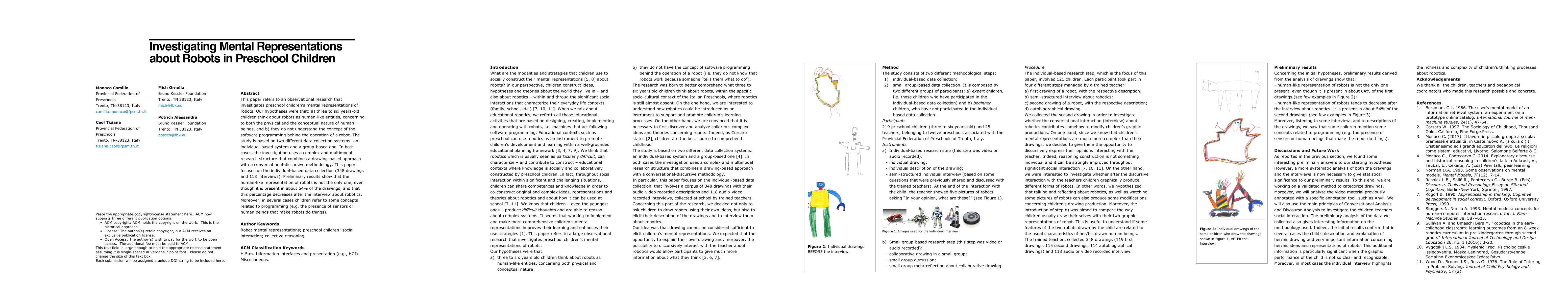 This study explores preschool children's mental representations of robots, finding that while many children view robots as human-like, a significant number also reference programming concepts. The research combines drawing and interviews to reveal diverse perceptions of robots among young children.