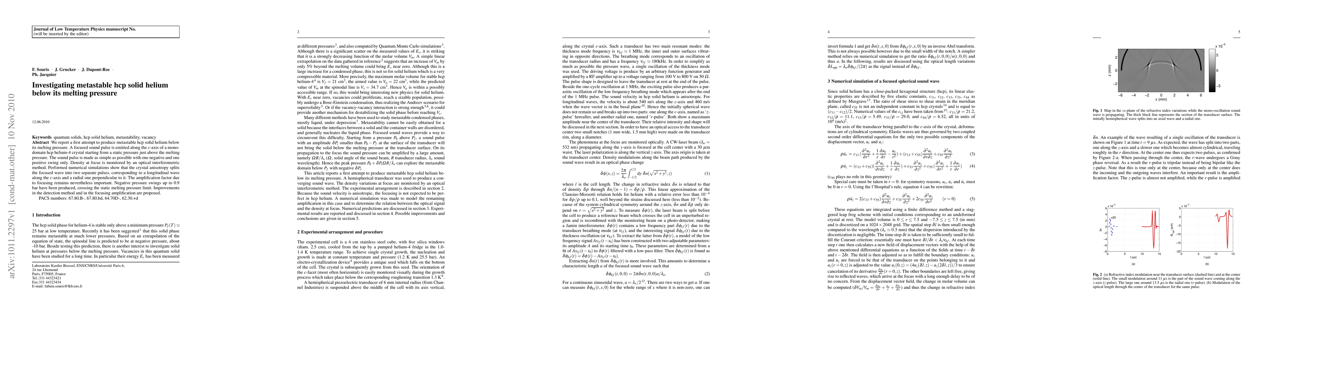 This study investigates the production of metastable hcp solid helium below its melting pressure using a focused sound pulse. Numerical simulations reveal that the crystal anisotropy generates two separate pulses, and negative pressure swings up to 0.9 bar were achieved, suggesting potential for further improvements in detection and amplification.