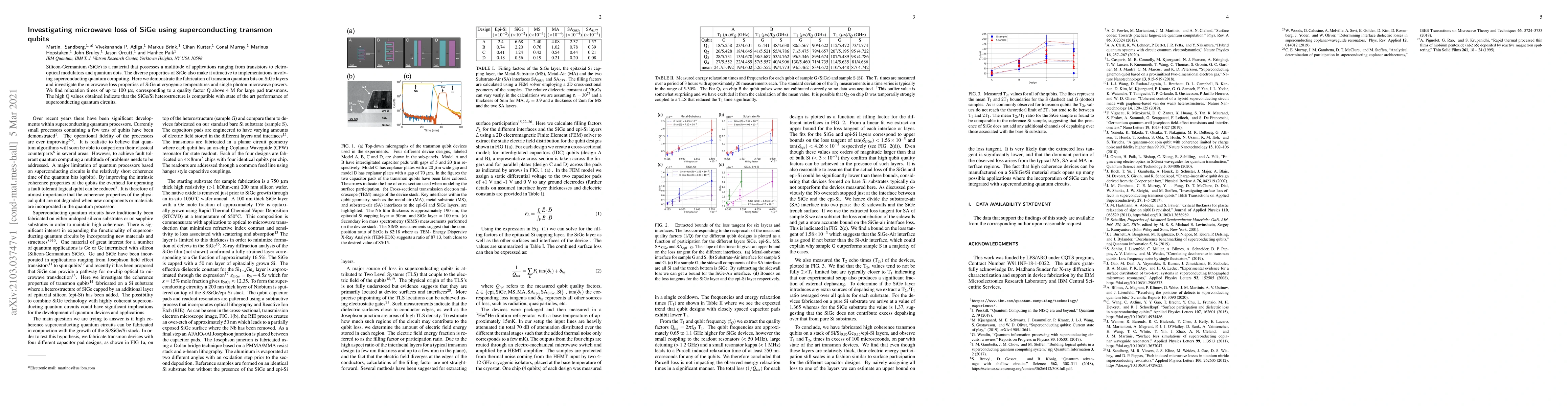 This paper investigates microwave loss in Silicon-Germanium (SiGe) using superconducting transmon qubits, finding high quality factors (Q > 4 M) and relaxation times up to 100 µs, demonstrating SiGe's compatibility with advanced superconducting quantum circuits.