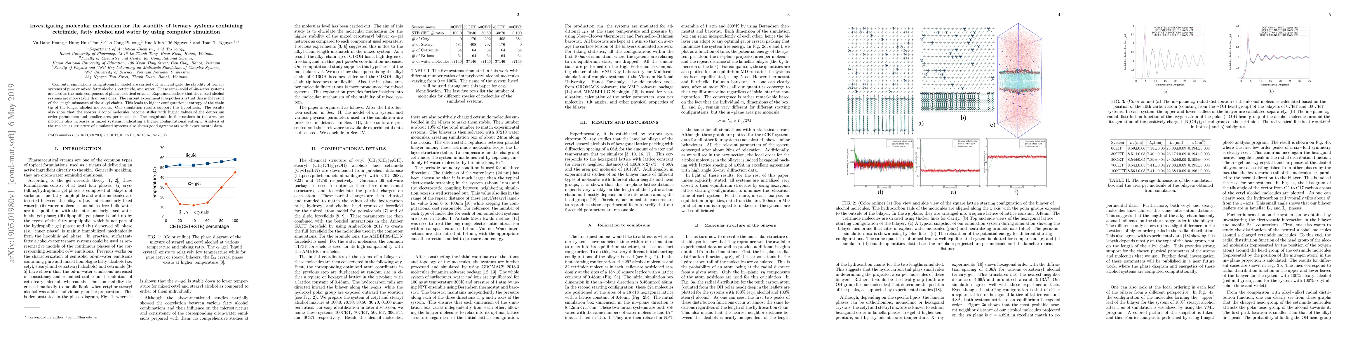 This paper uses computer simulations to explore the stability of ternary systems containing cetrimide, fatty alcohols, and water, which are key components in pharmaceutical creams. The simulations support the hypothesis that mixed alcohol systems are more stable due to the length mismatch of alkyl chains, leading to higher configurational entropy, and show that shorter alcohol molecules become stiffer in mixed systems.