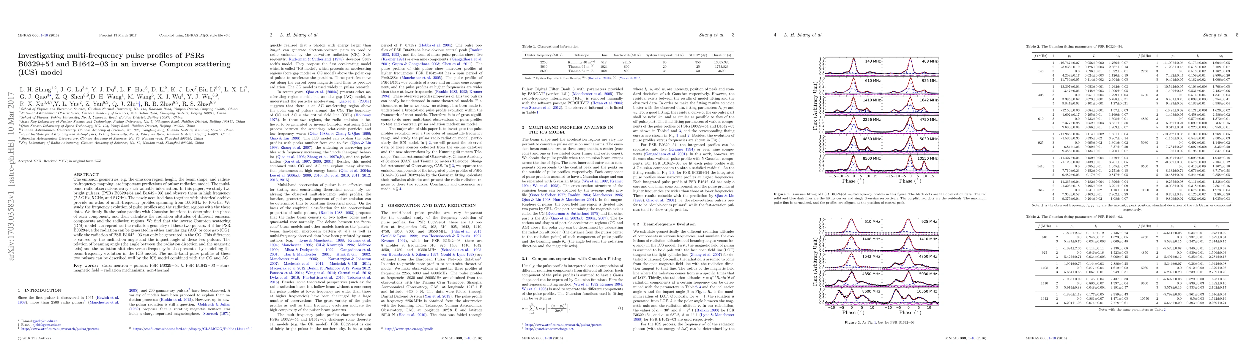 The emission geometries, e.g. the emission region height, the beam shape, and radius-to-frequency mapping, are important predictions of pulsar radiation model. The multi-band radio observations carry such valuable information. In this paper, we study two bright pulsars, (PSRs B0329+54 and B1642-03) and observe them in high frequency (2.5 GHz, 5 GHz, and 8 GHz). The newly acquired data together with historical archive provide an atlas of multi-frequency profiles spanning from 100 MHz to 10 GHz. We study the frequency evolution of pulse profiles and the radiation regions with the these data. We firstly fit the pulse profiles with Gaussian functions to determine the phase of each component, and then calculate the radiation altitudes of different emission components and the radiation regions. We find that the inverse Compton scattering (ICS) model can reproduce the radiation geometry of these two pulsars. But for PSR B0329+54 the radiation can be generated in either annular gap (AG) or core gap (CG), while the radiation of PSR B1642-03 can only be generated in the CG. This difference is caused by the inclination angle and the impact angle of these two pulsars. The relation of beaming angle (the angle between the radiation direction and the magnetic axis) and the radiation altitudes versus frequency is also presented by modelling the beam-frequency evolution in the ICS model. The multi-band pulse profiles of these two pulsars can be described well by the ICS model combined with the CG and AG.