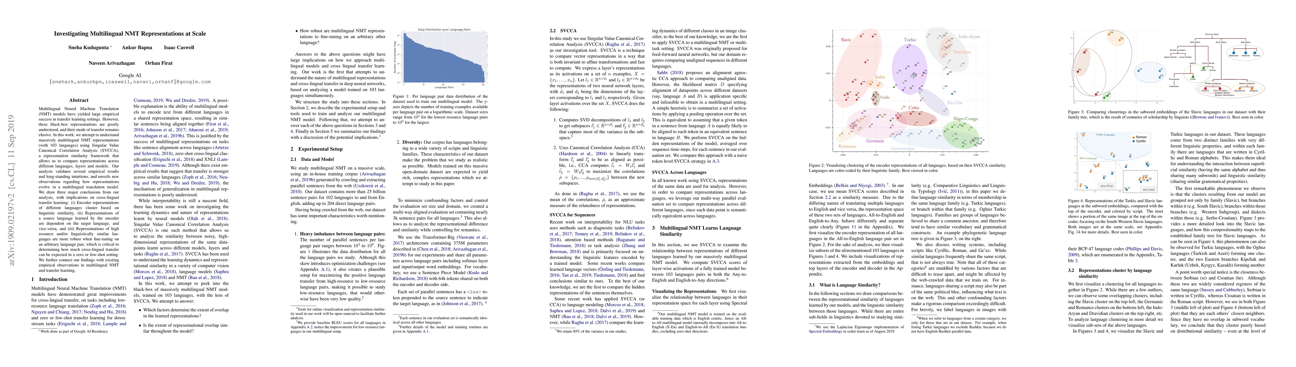 This study employs Singular Value Canonical Correlation Analysis (SVCCA) to investigate representations in a multilingual NMT model with 103 languages, revealing that encoder representations cluster by linguistic similarity and that source-target language interactions affect representation learning. The findings suggest higher robustness for high-resource languages in few-shot settings, with implications for cross-lingual transfer learning.
