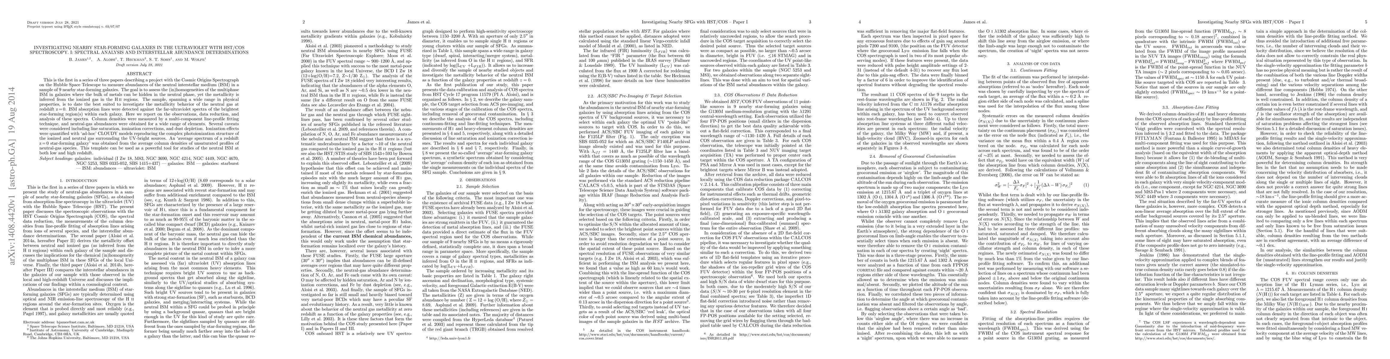 This paper presents the first in a series analyzing HST/COS spectra of 9 nearby star-forming galaxies to determine neutral interstellar medium abundances, revealing the metallicity behavior of the neutral gas at redshift z=0. The study employs multi-component fitting to measure column densities and derives average spectra for a template star-forming galaxy.