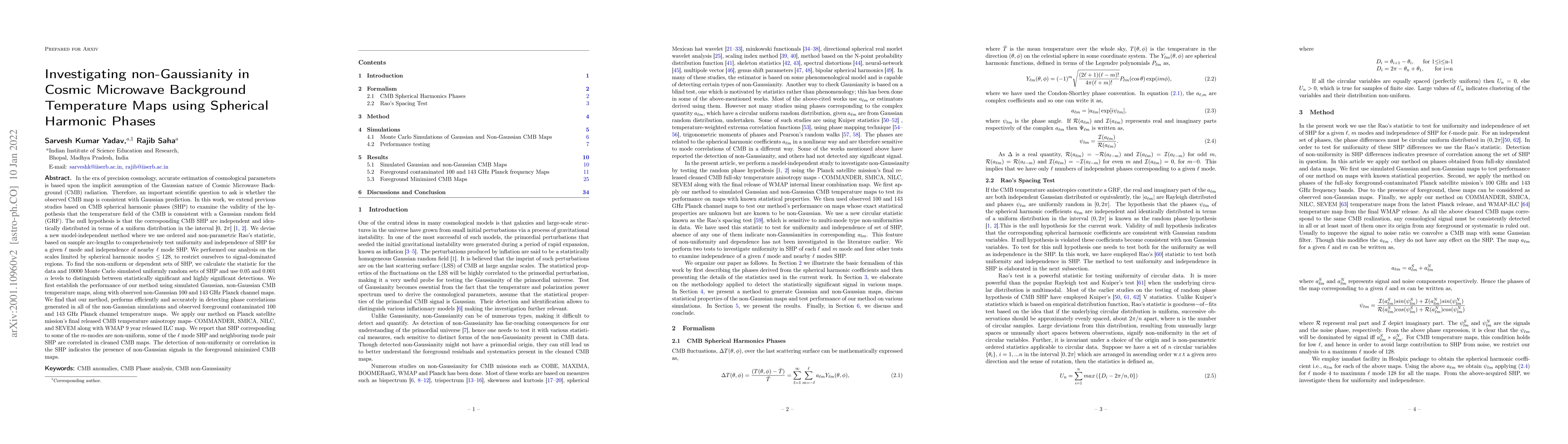 In this article, we extend previous studies based on CMB spherical harmonic phases (SHP) to examine the validity of the hypothesis that the temperature field of the CMB is consistent with a Gaussian random field (GRF). The null hypothesis is that the corresponding CMB SHP are independent and identically distributed in terms of a uniform distribution in the interval [0, 2$\pi$] \citep{1986ApJ...304...15B,2013rossmanith}. We devise a new model-independent method where we use ordered and non-parametric Rao's statistic, based on sample arc-lengths to comprehensively test uniformity and independence of SHP. We performed our analysis on the scales limited by spherical harmonic modes $\le$ 128, to restrict ourselves to signal-dominated regions. To find the non-uniform or dependent sets of SHP, we calculate the statistic for the data and 10000 Monte Carlo simulated uniformly random sets of SHP and use 0.05 and 0.001 $\alpha$ levels to distinguish between statistically significant and highly significant detections. We first establish the performance of our method using simulated Gaussian, non-Gaussian CMB temperature maps, along with observed non-Gaussian 100 and 143 GHz Planck channel maps. We find that our method performs efficiently and accurately in detecting phase correlations generated in all of the non-Gaussian simulations and observed foreground contaminated 100 and 143 GHz Planck channel temperature maps. We apply our method on the Planck satellite mission's final released CMB temperature anisotropy maps- COMMANDER, SMICA, NILC, and SEVEM along with WMAP 9 year released ILC map. We report that SHP corresponding to some of the $m$-modes is non-uniform, some of the $\ell$ mode SHP and neighboring mode pair SHP are correlated in cleaned CMB maps. The detection of non-uniformity or correlation in the SHP indicates the presence of non-Gaussian signals in the foreground minimized CMB maps.