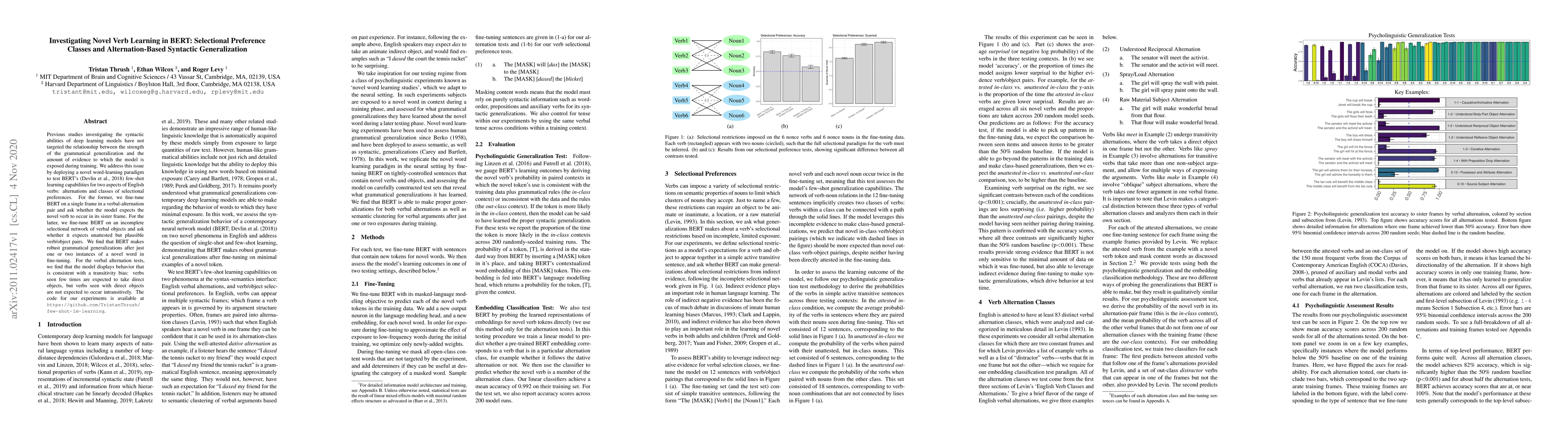 This study examines BERT's few-shot learning for verb alternations and selectional preferences, finding robust generalizations from minimal evidence. BERT shows a transitivity bias in alternations, expecting intransitive verbs to take direct objects when seen few times.