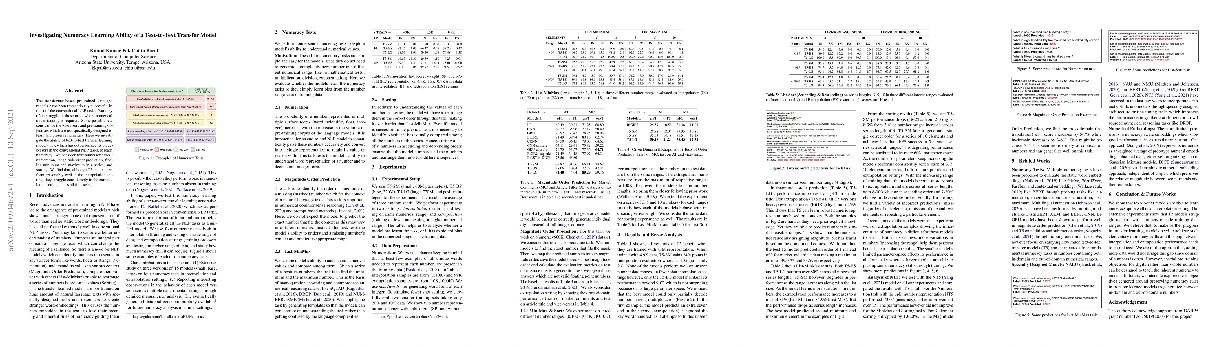 This paper investigates the numeracy learning ability of the text-to-text transfer model (T5) in four tasks: numeration, magnitude order prediction, finding minimum and maximum, and sorting. While T5 performs well in conventional NLP tasks, it struggles in the extrapolation setting for numeracy tasks.