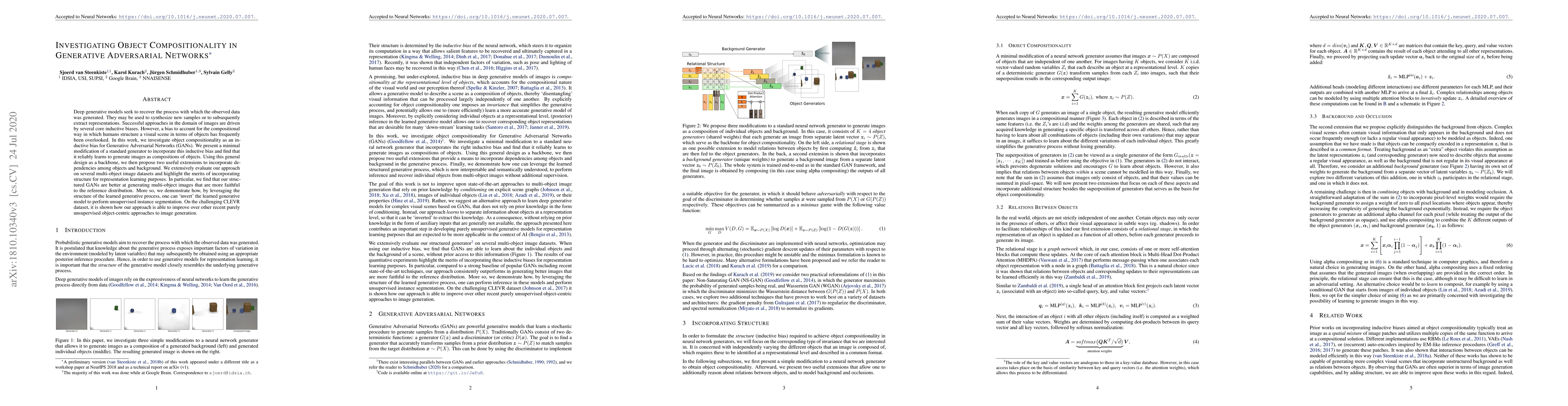 This paper explores incorporating object compositionality as an inductive bias in Generative Adversarial Networks (GANs) to improve multi-object image generation. The authors propose a modified GAN with extensions to model object dependencies, demonstrating better performance in generating realistic multi-object images and achieving unsupervised instance segmentation.