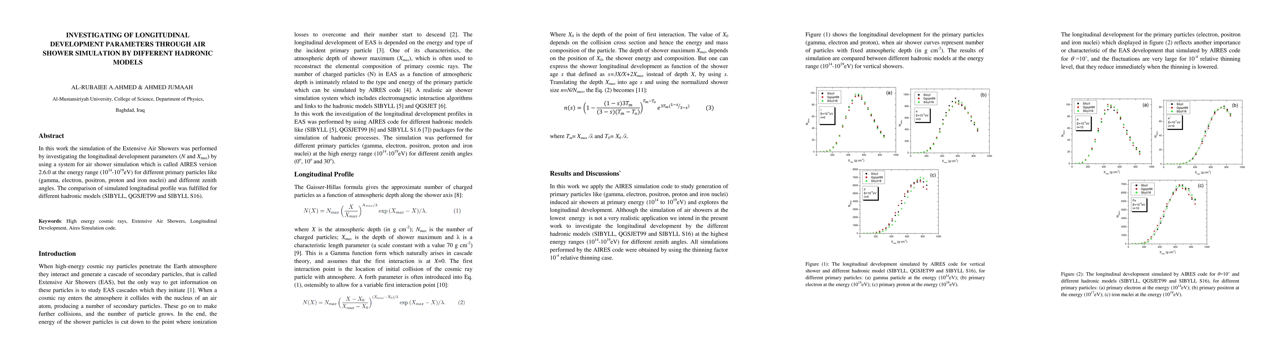 This study simulates Extensive Air Showers using AIRES version 2.6.0 to analyze longitudinal development parameters (N and Xmax) across a wide energy range for various primary particles and zenith angles, comparing results from different hadronic models (SIBYLL, QGSJET99, and SIBYLL S16). The findings aim to understand the impact of these models on air shower simulations.
