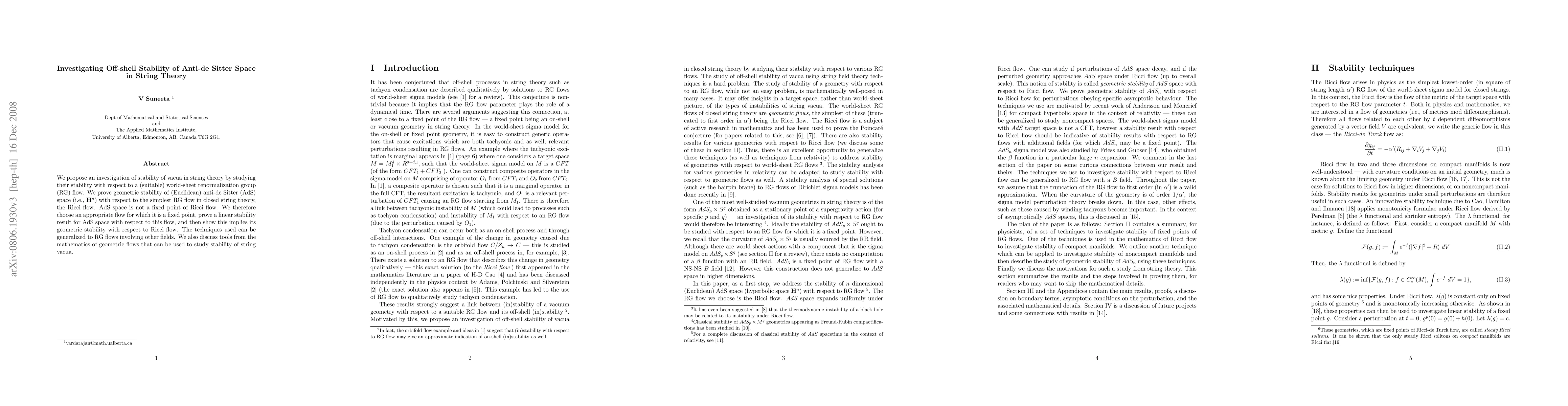 This paper investigates the stability of vacua in string theory through the study of world-sheet renormalization group flows, proving the geometric stability of Euclidean anti-de Sitter space under Ricci flow by finding an appropriate flow for which AdS is a fixed point. Techniques developed can be extended to other RG flows and fields.