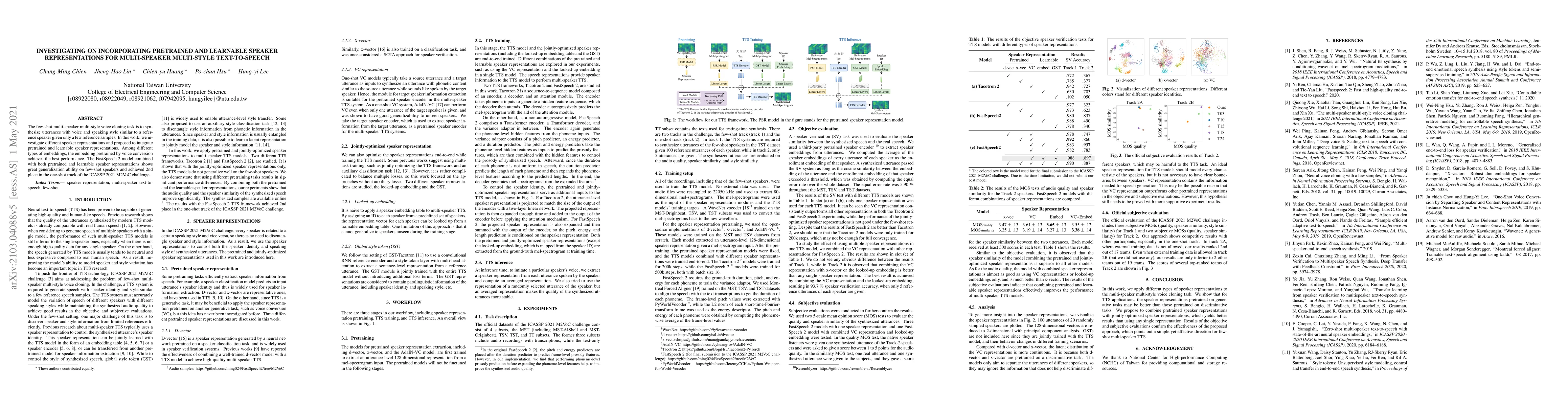 The few-shot multi-speaker multi-style voice cloning task is to synthesize utterances with voice and speaking style similar to a reference speaker given only a few reference samples. In this work, we investigate different speaker representations and proposed to integrate pretrained and learnable speaker representations. Among different types of embeddings, the embedding pretrained by voice conversion achieves the best performance. The FastSpeech 2 model combined with both pretrained and learnable speaker representations shows great generalization ability on few-shot speakers and achieved 2nd place in the one-shot track of the ICASSP 2021 M2VoC challenge.