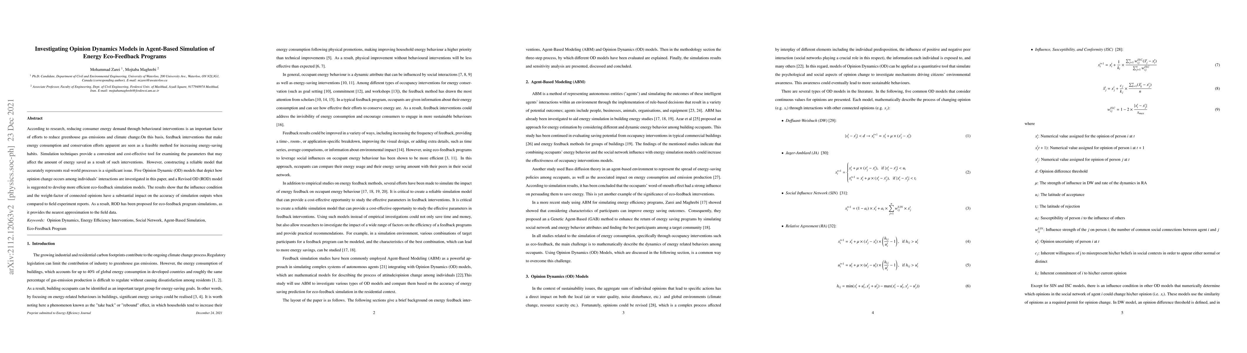 According to research, reducing consumer energy demand through behavioural interventions is an important factor of efforts to reduce greenhouse gas emissions and climate change.On this basis, feedback interventions that make energy consumption and conservation efforts apparent are seen as a feasible method for increasing energy-saving habits. Simulation techniques provide a convenient and cost-effective tool for examining the parameters that may affect the amount of energy saved as a result of such interventions. However, constructing a reliable model that accurately represents real-world processes is a significant issue. Five Opinion Dynamic (OD) models that depict how opinion change occurs among individuals interactions are investigated in this paper, and a Revised OD (ROD) model is suggested to develop more efficient eco-feedback simulation models. The results show that the influence condition and the weight-factor of connected opinions have a substantial impact on the accuracy of simulation outputs when compared to field experiment reports. As a result, ROD has been proposed for eco-feedback program simulations, as it provides the nearest approximation to the field data.