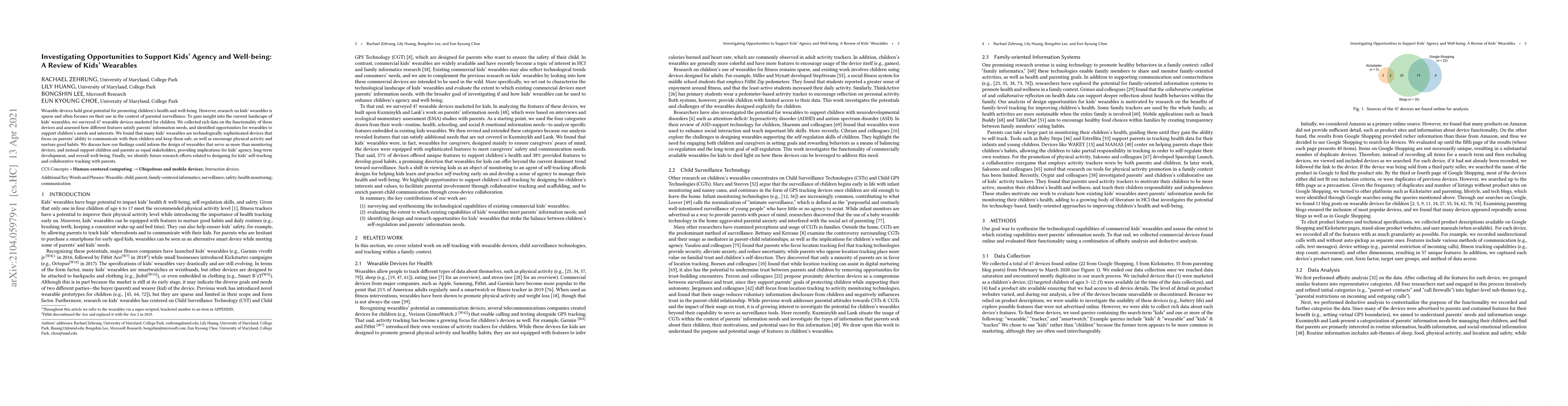 This paper reviews 47 kids' wearable devices, finding that while they are technologically advanced, they primarily focus on parental surveillance and safety. The study suggests opportunities for these devices to better support children's agency and well-being by fostering collaboration between children and parents.