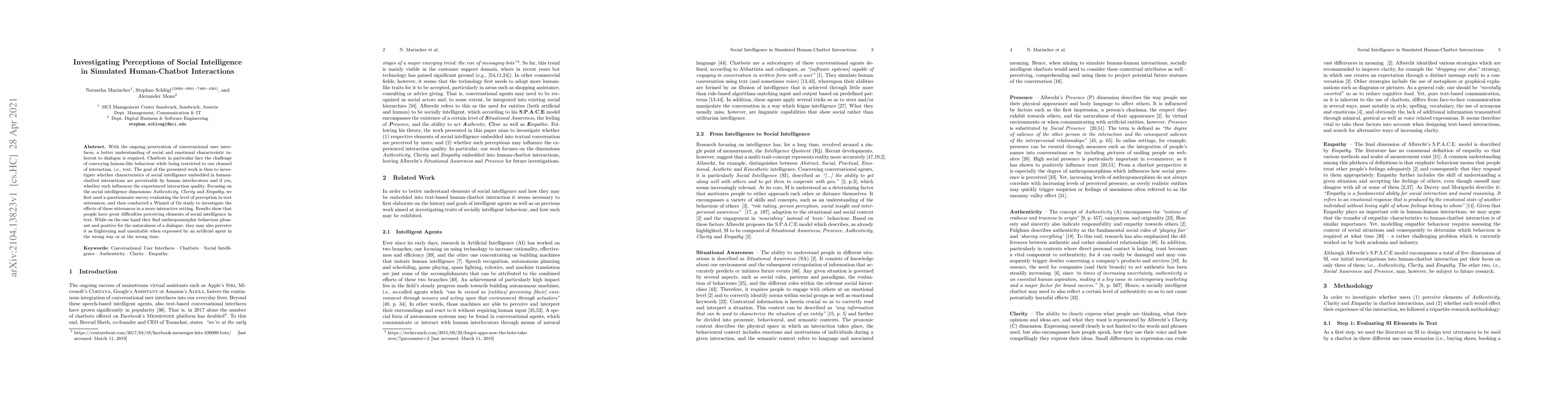 With the ongoing penetration of conversational user interfaces, a better understanding of social and emotional characteristic inherent to dialogue is required. Chatbots in particular face the challenge of conveying human-like behaviour while being restricted to one channel of interaction, i.e., text. The goal of the presented work is thus to investigate whether characteristics of social intelligence embedded in human-chatbot interactions are perceivable by human interlocutors and if yes, whether such influences the experienced interaction quality. Focusing on the social intelligence dimensions Authenticity, Clarity and Empathy, we first used a questionnaire survey evaluating the level of perception in text utterances, and then conducted a Wizard of Oz study to investigate the effects of these utterances in a more interactive setting. Results show that people have great difficulties perceiving elements of social intelligence in text. While on the one hand they find anthropomorphic behaviour pleasant and positive for the naturalness of a dialogue, they may also perceive it as frightening and unsuitable when expressed by an artificial agent in the wrong way or at the wrong time.