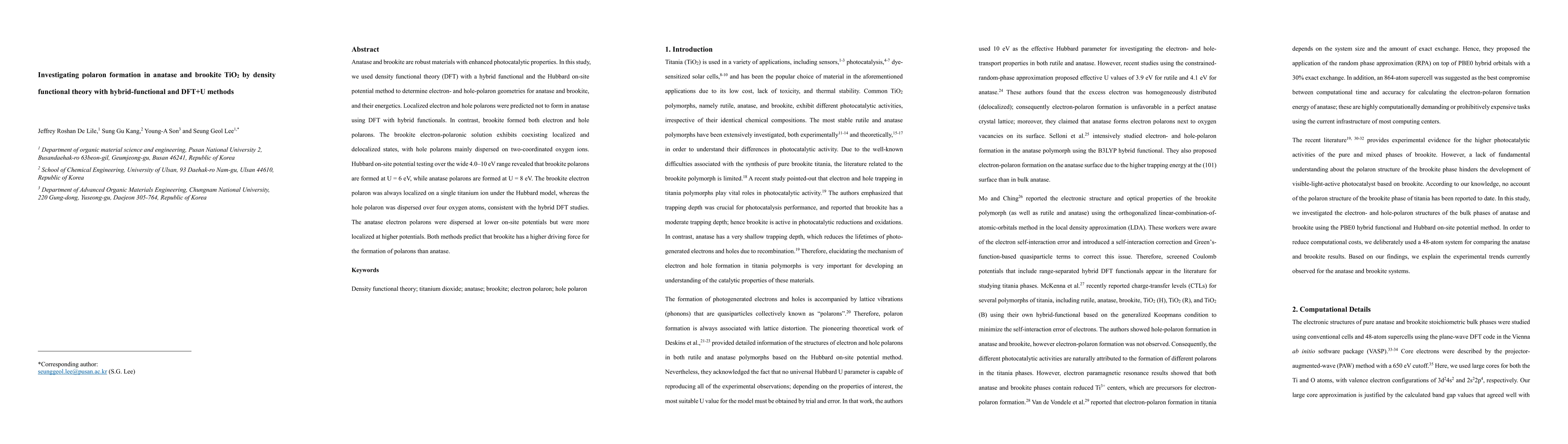 Anatase and brookite are robust materials with enhanced photocatalytic properties. In this study, we used density functional theory (DFT) with a hybrid functional and the Hubbard on-site potential methods to determine electron and hole polaron geometries for anatase and brookite and their energetics. Localized electron and hole polarons were predicted not to form in anatase using DFT with hybrid functionals. In contrast, brookite formed both electron and hole polarons. The brookite electron-polaronic solution exhibits coexisting localized and delocalized states, with hole polarons mainly dispersed on two-coordinated oxygen ions. The Hubbard on-site potential testing over the wide range of 4 eV to 10 eV revealed that brookite polarons are formed at 6 eV, while anatase polarons are formed at 8 eV. The brookite electron polaron was always localized on a single titanium ion under the Hubbard model, whereas the hole polaron was dispersed over four oxygen atoms, consistent with the hybrid DFT studies. The anatase electron polarons were dispersed at lower on-site potentials but were more localized at higher potentials. Both methods predict that brookite has a higher driving force for the formation of polarons than anatase.