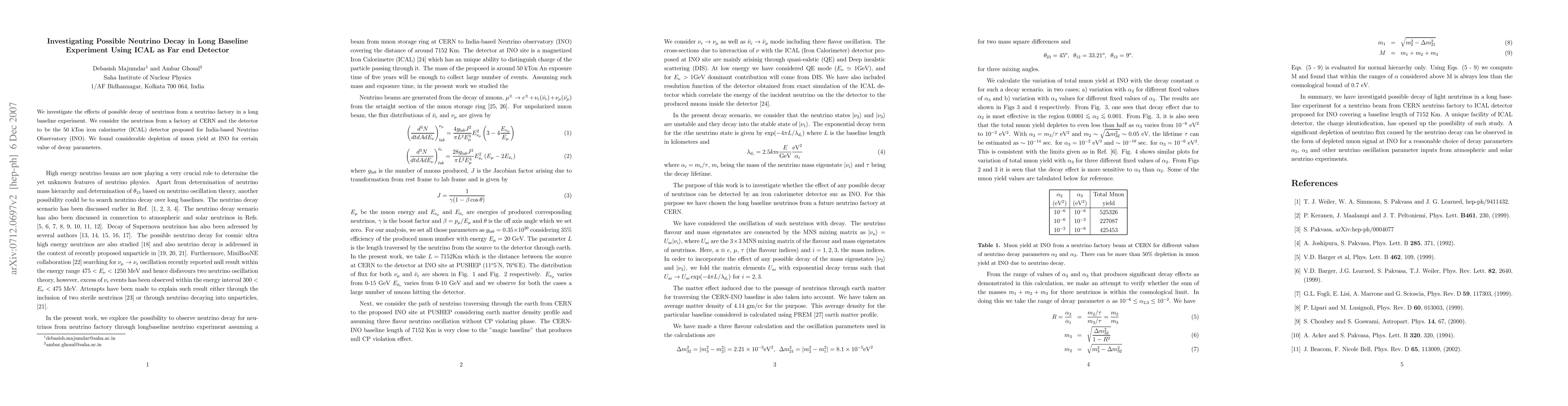 We investigate the effects of possible decay of neutrinos from a neutrino factory in a long baseline experiment. We consider the neutrinos from a factory at CERN and the detector to be the 50 kTon iron calorimeter (ICAL) detector proposed for India-based Neutrino Observatory (INO). We found considerable depletion of muon yield at INO for certain value of decay parameters.