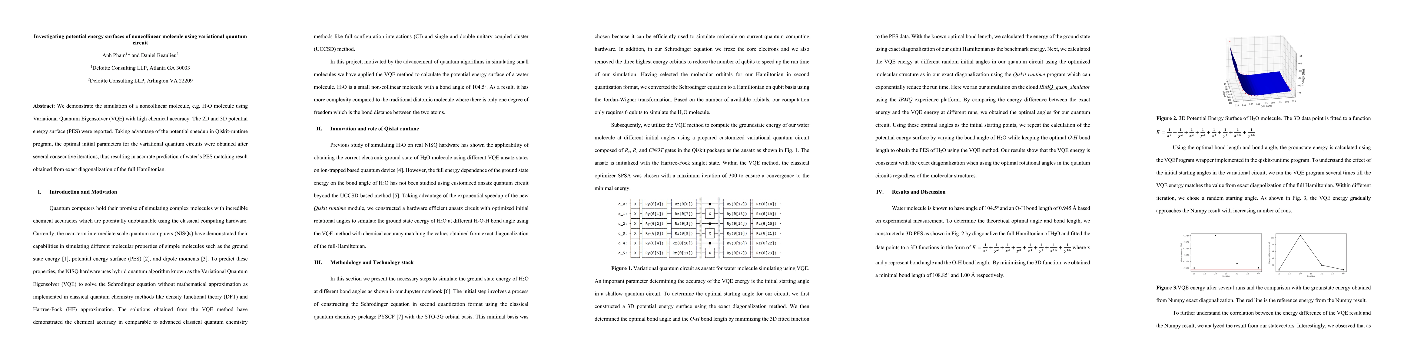 This paper investigates the potential energy surfaces of noncollinear molecules like H2O using Variational Quantum Eigensolver (VQE) techniques. The study reports accurate 2D and 3D potential energy surfaces, leveraging Qiskit for optimal circuit parameter tuning and achieving results comparable to exact diagonalization.