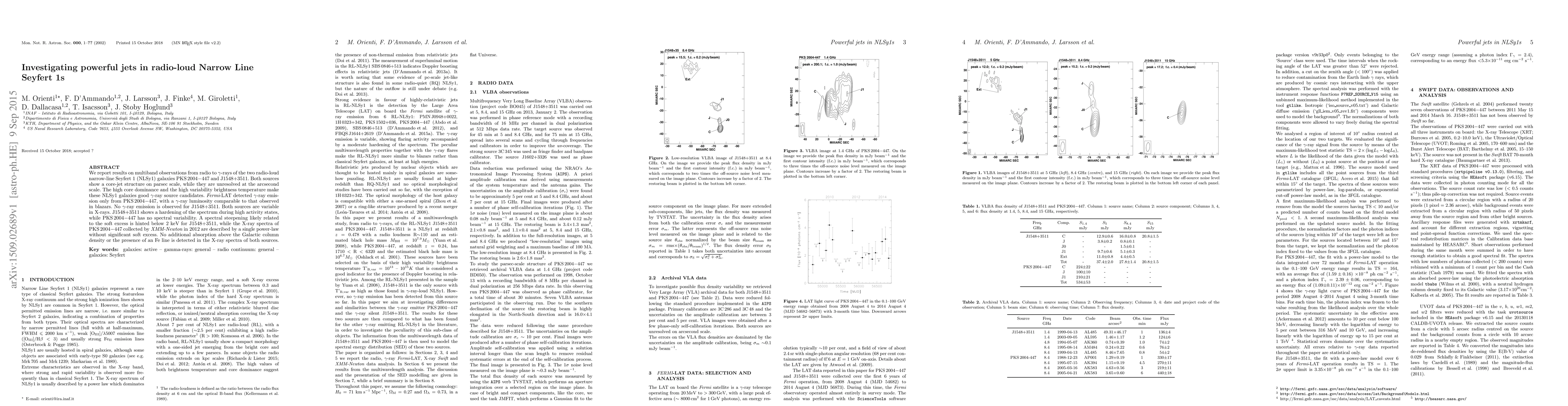 We report results on multiband observations from radio to gamma-rays of the two radio-loud narrow-line Seyfert 1 (NLSy1) galaxies PKS 2004-447 and J1548+3511. Both sources show a core-jet structure on parsec scale, while they are unresolved at the arcsecond scale. The high core dominance and the high variability brightness temperature make these NLSy1 galaxies good gamma-ray source candidates. Fermi-LAT detected gamma-ray emission only from PKS 2004-447, with a gamma-ray luminosity comparable to that observed in blazars. No gamma-ray emission is observed for J1548+3511. Both sources are variable in X-rays. J1548+3511 shows a hardening of the spectrum during high activity states, while PKS 2004-447 has no spectral variability. A spectral steepening likely related to the soft excess is hinted below 2 keV for J1548+3511, while the X-ray spectra of PKS 2004-447 collected by XMM-Newton in 2012 are described by a single power-law without significant soft excess. No additional absorption above the Galactic column density or the presence of an Fe line is detected in the X-ray spectra of both sources.