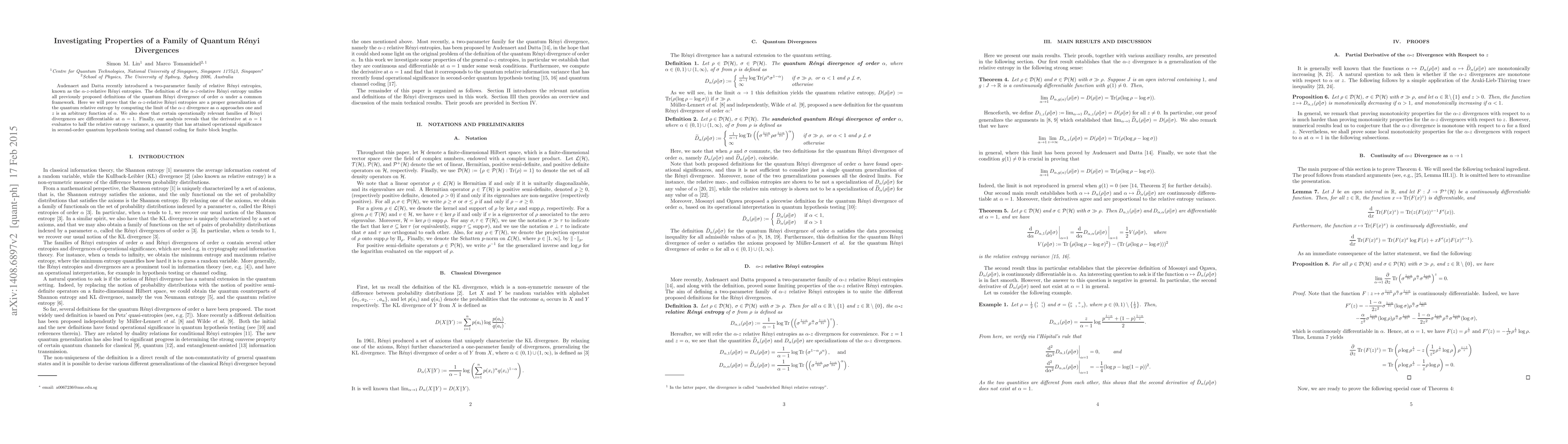This paper investigates the properties of a two-parameter family of quantum Rényi divergences, proving they generalize quantum relative entropy. It also demonstrates the differentiability of relevant families at α=1, with the derivative equaling half the relative entropy variance.