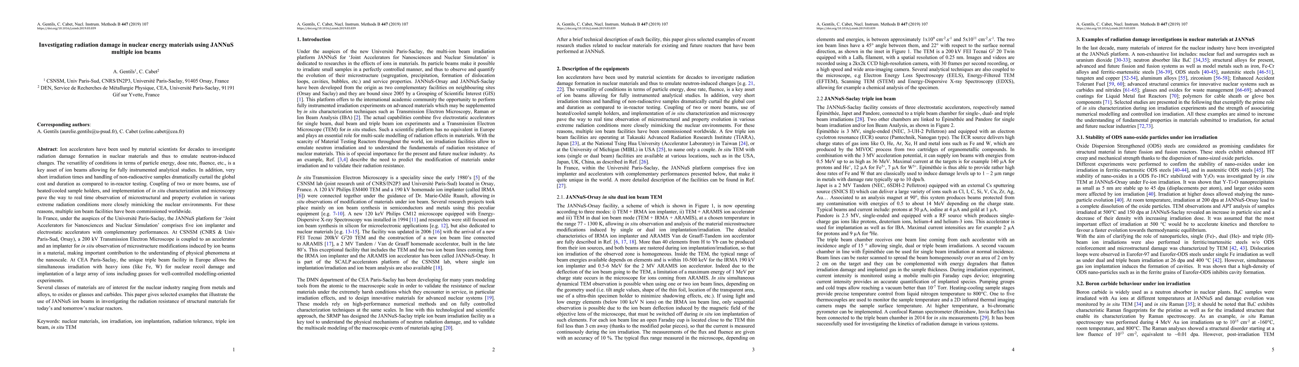 This paper explores the use of JANNuS multiple ion beam facilities in France to study radiation damage in nuclear energy materials, providing insights into microstructural and property evolution under extreme conditions. The research highlights the advantages of ion beam techniques over traditional in-reactor testing.
