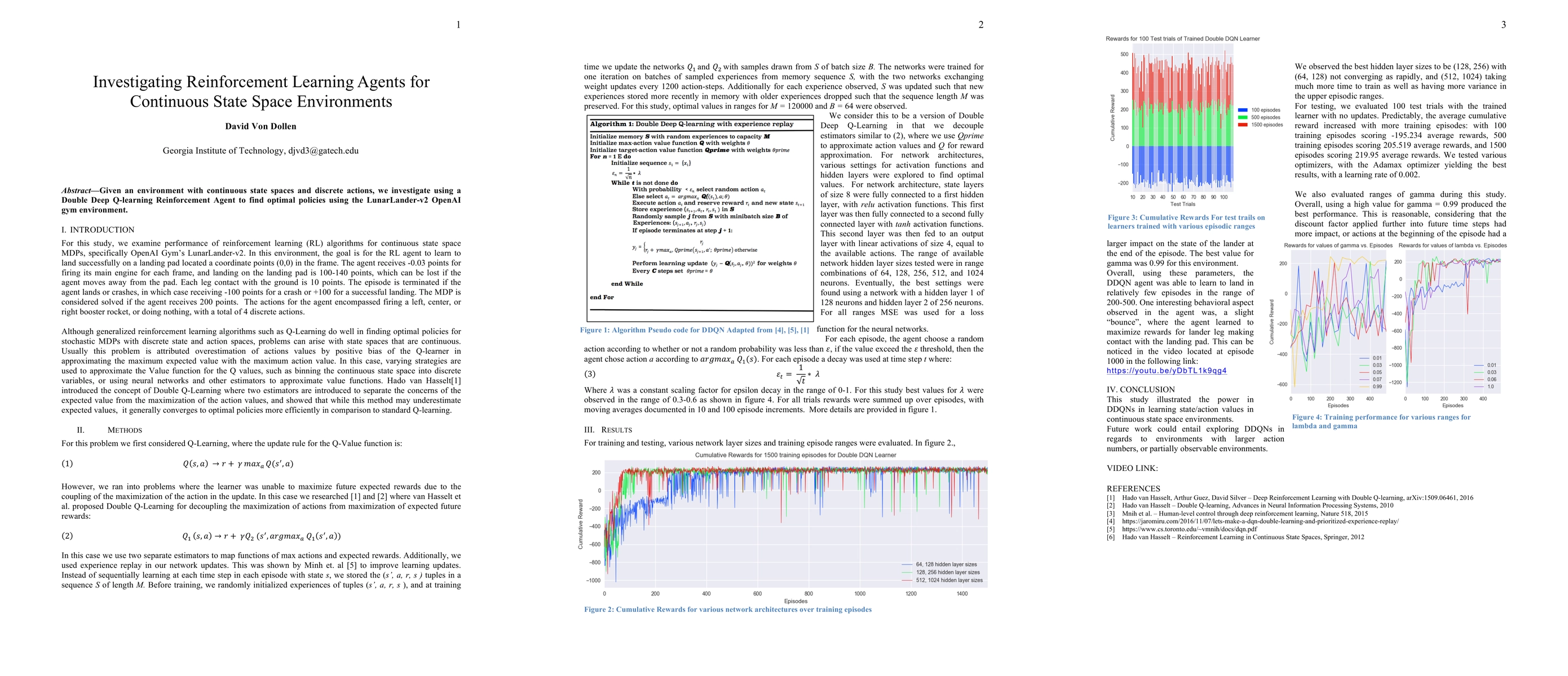 Summary: This study explores the application of a Double Deep Q-learning agent in continuous state environments with discrete actions, specifically testing its effectiveness in optimizing policies within the LunarLander-v2 environment from the OpenAI gym.