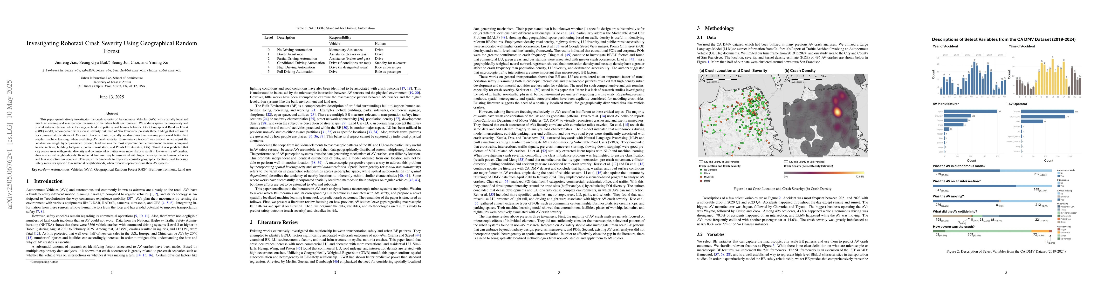 The development and application of a Geographical Random Forest model for localized prediction of AV crash severity, addressing spatial autocorrelation in urban crash data.